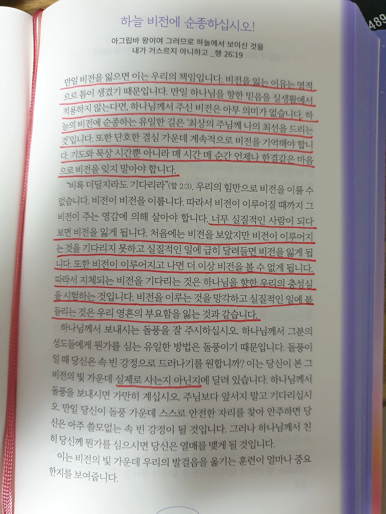만일 비전을 잃으면 이는 우리의 책임입니다. 비전을 잃는 이유는 영적으로 틈이 생겼기 때문입니다. 만일 하나님을 향한 믿음을 실생활에서 적용하지 않는다면 하나님께서 주신 비전은 아무 의미가 없습니다. 하늘의 비전에 순종하는 유일한 길은 '최상의 주님께 나의 최선을 드리는 것'입니다. 또한 단호한 결심 가운데 계속적으로 비전을 기억해야 합니다. 기도와 묵상 시간뿐 아니라 매 시간 매 순간 언제나 한결같은 마음으로 비전을 잊지 말아야 합니다.