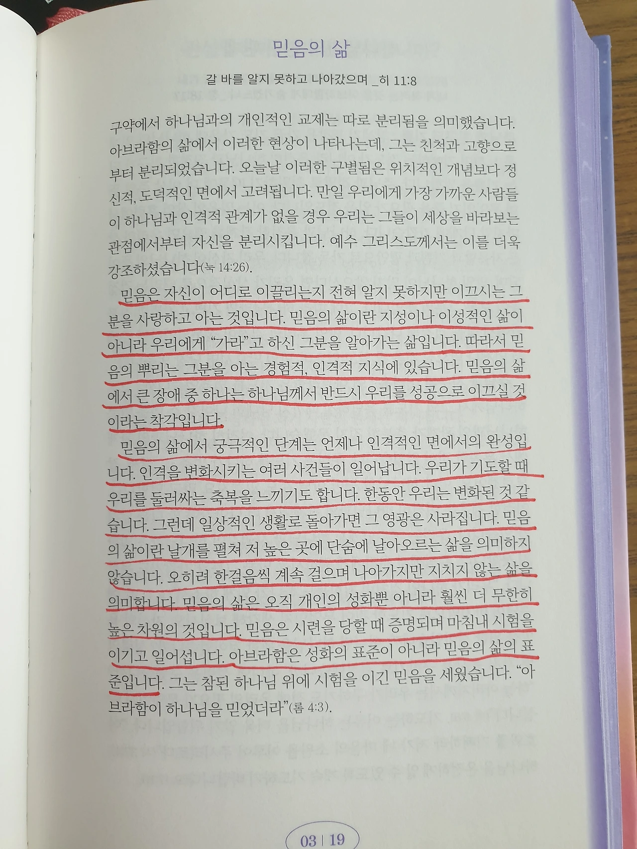 믿음은 자신이 어디로 이끌리는지 전혀 알지 못하지만 이끄시는 그분을 사랑하고 아는 것입니다. 믿음의 삶이란 지성이나 이성적인 삶이 아니라 우리에게 "가라"고 하신 그분을 알아가는 삶입니다. 따라서 믿음의 뿌리는 그분을 아는 경험적, 인격적 지식에 있습니다. 믿음의 삶에서 가장 큰 장애 중 하나는 하나님께서 반드시 우리를 성공으로 이끄실 것이라는 착각입니다.