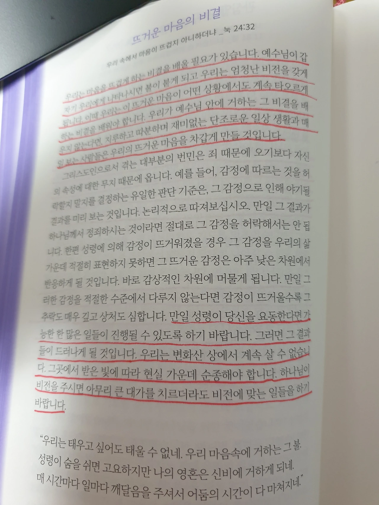 우리는 마음을 뜨겁게 하는 비결을 배울 필요가 있습니다. 예수님이 갑자기 우리에게 나타나시면 불이 붙게 되고 우리는 엄청난 비전을 갖게 됩니다. 이때 우리는 이 뜨거운 마음이 어떤 상황에서도 계속 타오르게 하는 비결을 배워야 하니다. 우리가 예수님 안에 거하는 그 비결을 배우지 않는다면, 지루하고 따분하며 재미없는 단조로운 일상생활과 매일 보는 사람들은 우리의 뜨거운 마음을 차갑게 만들 것입니다.