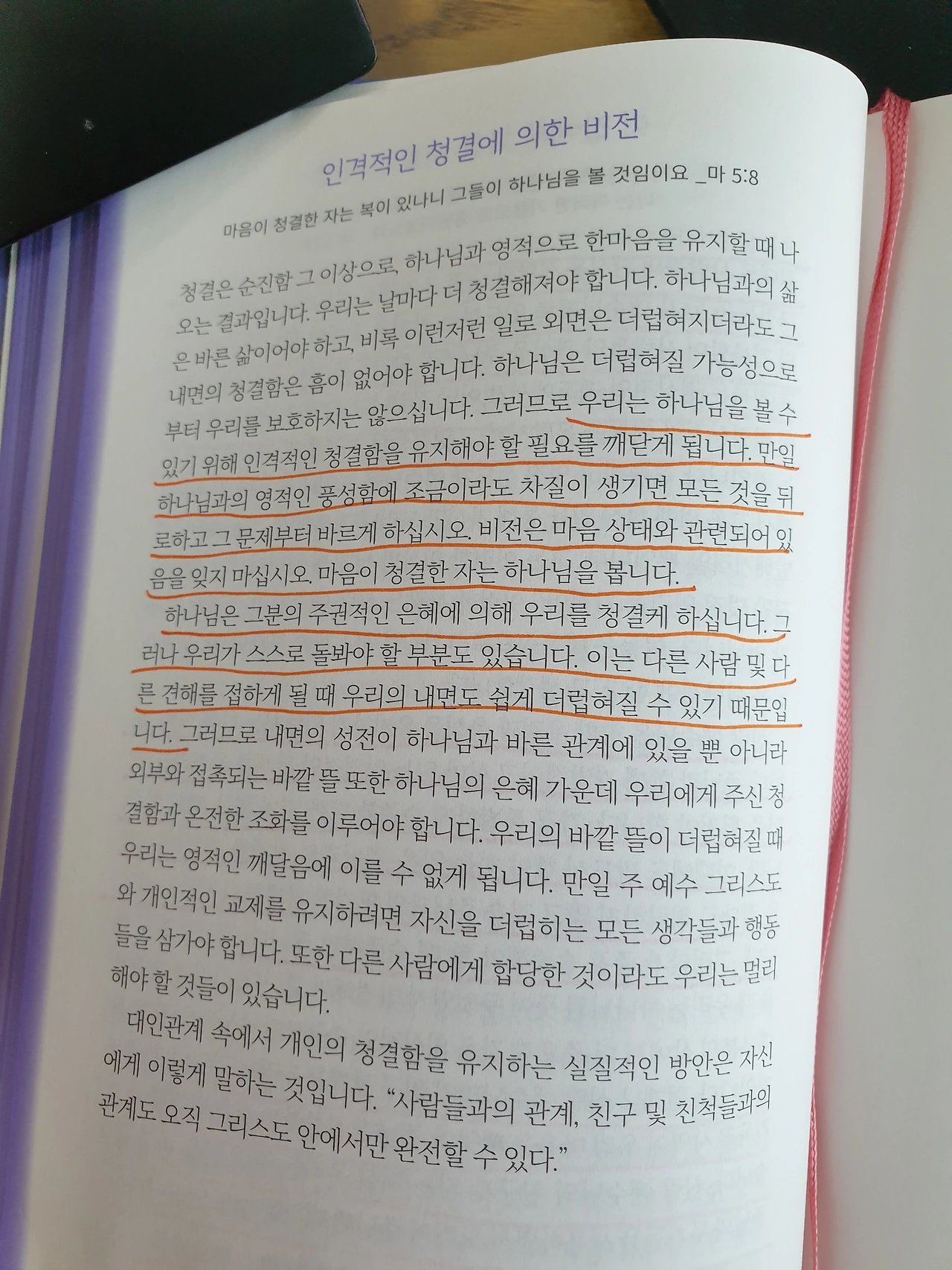 우리는 하나님을 볼 수 있기 위해 인격적인 청결함을 유지해야 할 필요를 깨닫게 됩니다. 만일 하나님과의 영적인 풍성함에 조금이라도 차질이 생기면 모든 것을 뒤로하고 그 문제부터 바르게 하십시오. 비전은 마음 상태와 관련되어 있음을 잊지 마십시오. 마음이 청결한 자는 하나님을 봅니다. 하나님은 그분의 주권적인 은혜에 의해 우리를 청결케 하십니다. 그러나 우리가 스스로 돌봐야 할 부분도 있습니다. 이는 다른 사람 및 다른 견해를 접하게 될 때 우리의 내면도 쉽게 더럽혀질 수 있기 때문입니다.