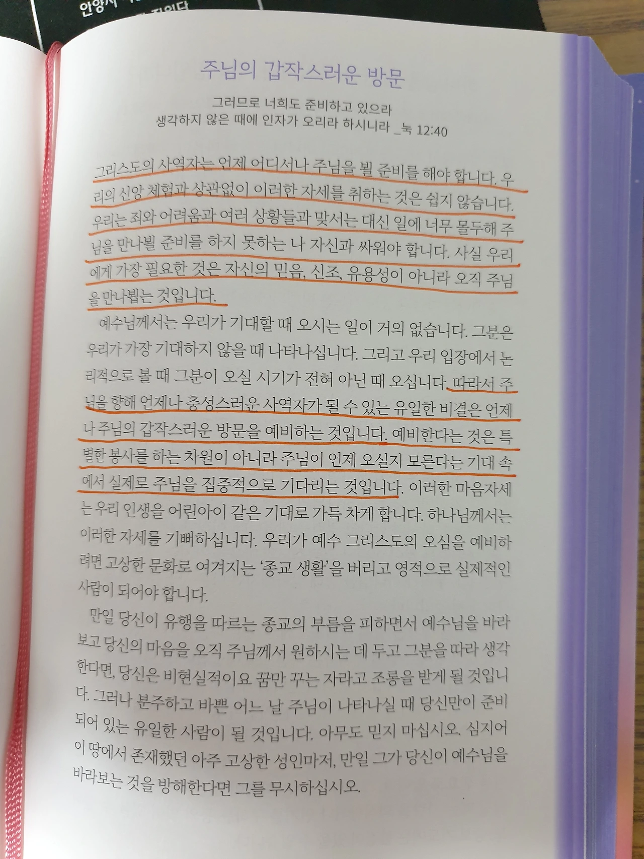 그러므로 너희도 준비하고 있으라 생각하지 않은 때에 인자가 오리라 하시니라 (눅 12:40)