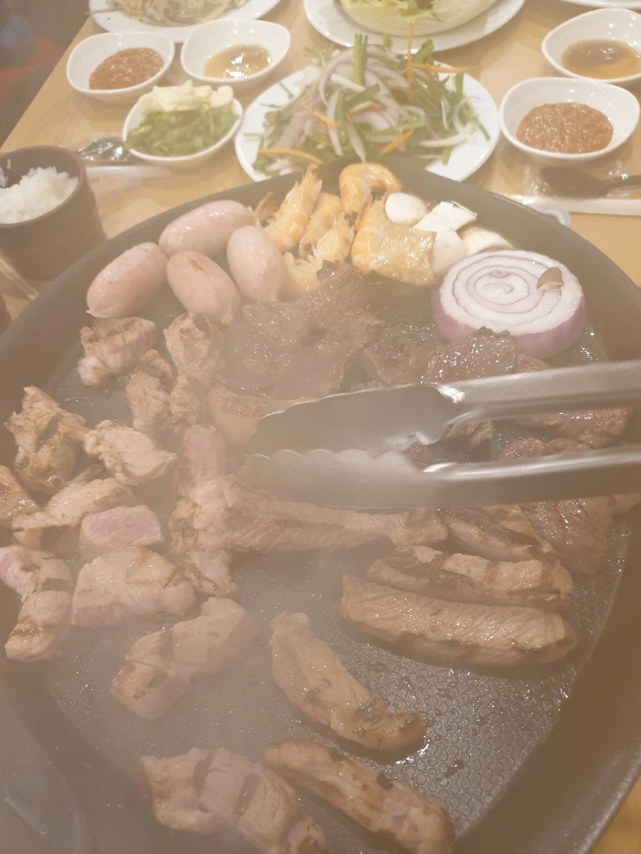고기 굽는 연기 덕분에 뿌연 식탁