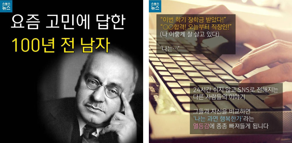 마지막으로 텍스트다. 사실 모든 유형의 콘텐츠가 카드뉴스에 적합하진 않다. 먼저 리스티클이 카드뉴스에 잘 어울린다. 리스티클은 리스트(list)와 기사(article)의 합성어로 목록 형식의 기사를 말한다. 예컨대 ‘성공하는 사람들의 7가지 습관’, ‘서른이 되기 전에 해야 할 10가지’, ‘오사카에서 꼭 가봐야 할 맛집 TOP 5’ 같은 식이다. 두 번째로 기-승-전-결이 있는 스토리다. 총 길이는 15컷 내외가 적당하다. 모바일 콘텐츠는 길어서 좋을 게 없다. 하지만 짧더라도 한 편의 스토리로 완결되어야 한다. 짧은 이야기 속에서도 사람들은 무언가를 얻어가려고 하기 때문이다. 이때에는 인물 중심의 이야기가 효과적이다. 페이스북에서 폭발적인 인기를 끈 <열정에 기름 붓기>나 <스브스뉴스>에서, 벤치마킹할 만한 카드뉴스를 만나볼 수 있다.