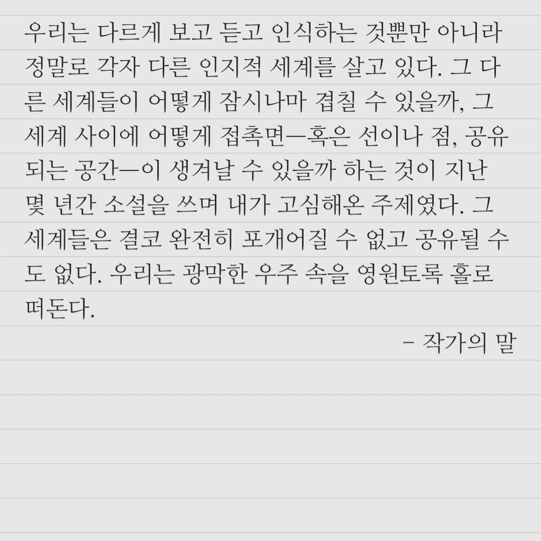 비록, 장편소설은 단편소설에 비해 내용에서의 밀도가 낮은 느낌이 있으나, 김초엽은 다양한 관계와 감정들로 빈 공간들을 풍부하게 채워준다. 김초엽에 대한 평 중 '김초엽을 어떻게 이름도 김초엽인가'하는 평에 적극 공감한다. 이름마저 SF스러운 그의 책이 더 많은 사람들에게 '과학 기술의 발전이 이끈 미래가 좋은 세상일까'를 고민하게 만들기를 바란다.