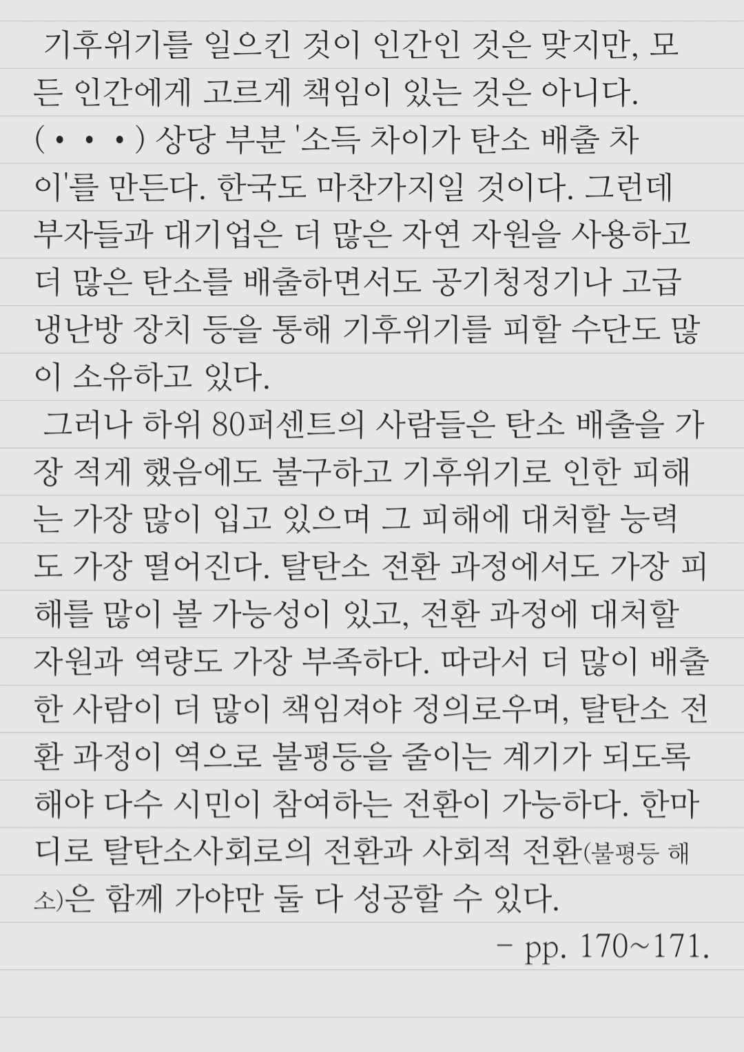 기후위기 또한 진보가 집중해야 하는 중대 사안이다. 탄소 사회로부터 벗어나는 것에서 나아가 그 이행과정에서 불평등을 동시에 해결하는 진보의 강력한 전환 전략이 필요하다. 기후위기 대응 전략은 에너지 전환 전략이자, 국가의 역할이나 목표 등 철학적 논의들마저 모두 새로 구성하는 작업이며, 시민들의 삶에 급진적 변화를 초래하는 거대 전략이다. 그런데 기후위기에 대한 책임이 고소득자가 더 큼에도 그 피해는 저소득자들이 더 크게 겪으며, 이들은 탈탄소 전환 과정에 대응•대비할 역량도 작아 전환의 피해를 볼 가능성도 크다. 따라서 기후위기 대응은 불평등 대응과 함께 이루어져야만 시민들의 참여를 이끌어 성공할 수 있다.