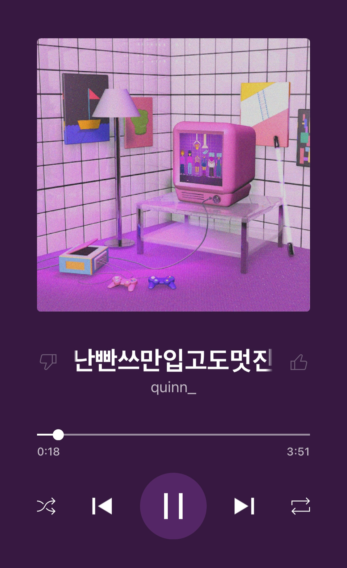 신나고 레트로한 비트에 무기력한 톤, 재밌고 이상한 말장난 같은 가사와 몽롱한 목소리. 처음으로 접한 쿠인의 노래는 꽤 재밌었고, 앞으로도 종종 마주하는 가수가 됐으면 좋겠다. 찾아보니 사운드클라우드로 유명한 가수였다고 하고, 데뷔곡으로 뭘 고를까 고민하다가 확실하게 각인되고 싶어 이 노래를 골랐다고 한다. 어그로를 잘 끄는 법을 알고, 그게 마냥 미끼인 것만도 아니라는 점이 좋다.