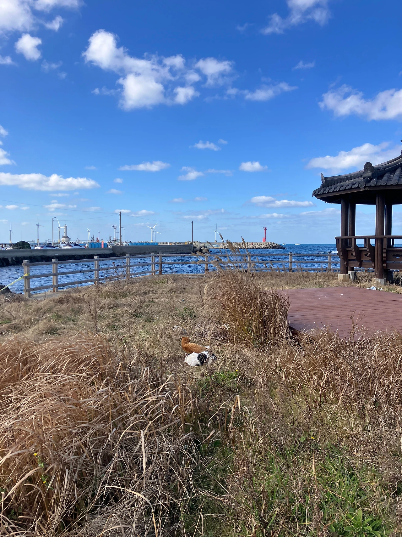 정자 쉼터 옆에 냥이들이 옹기종기 모여 앉아있네요.