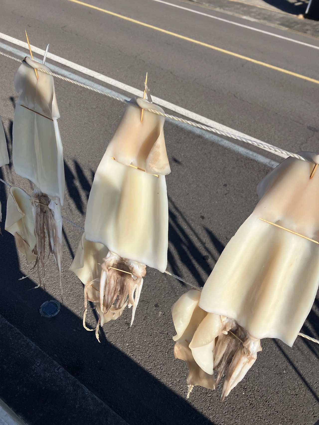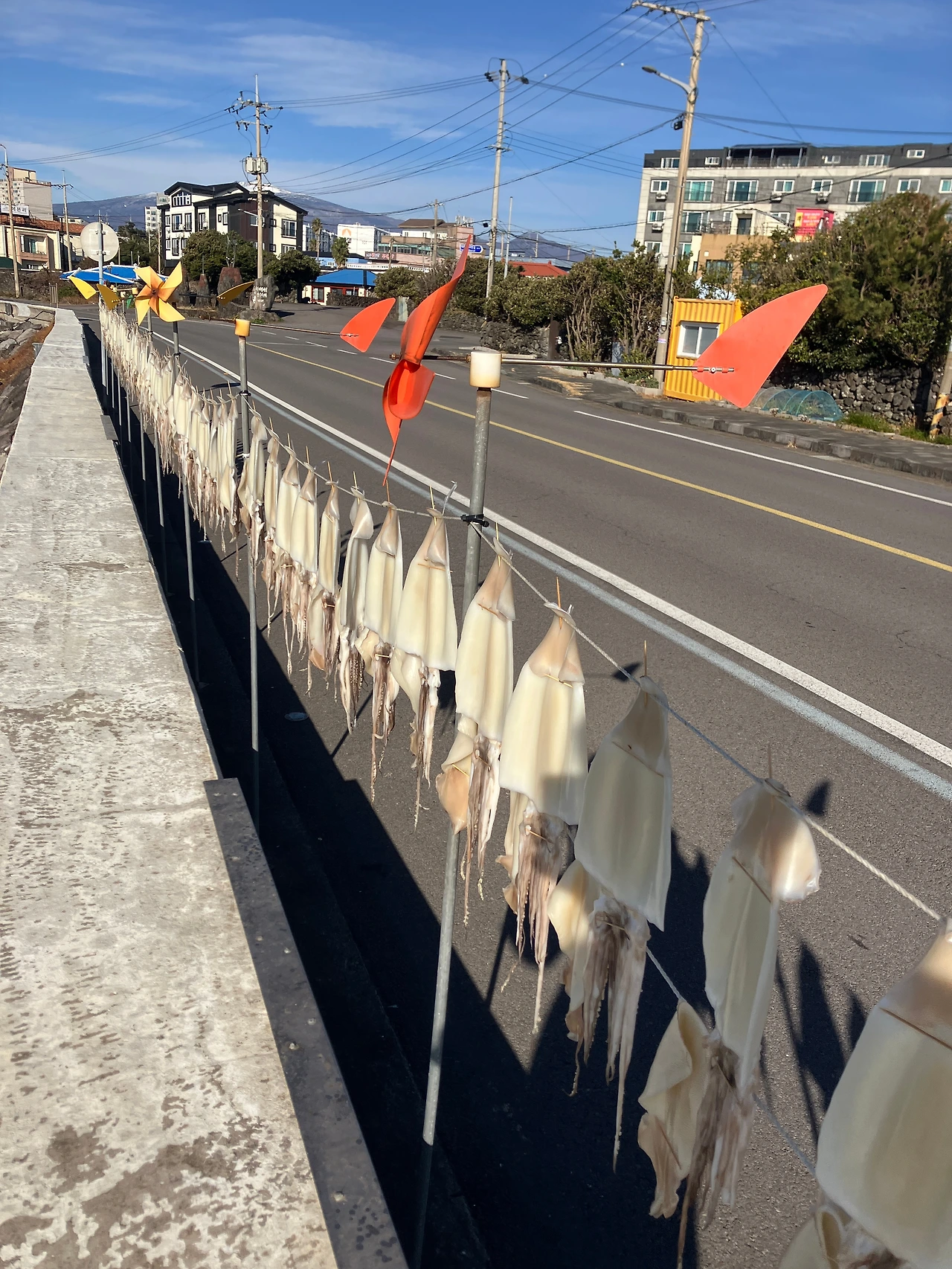 둑 위로 올라가서 한참을 걷다가 따듯한 햇빛과 시원한 해풍이라는 역설적인 온냉기법(?)으로 말려지고 있는 먹음직스러운 오징어 분들의 대열을 만납니다.
