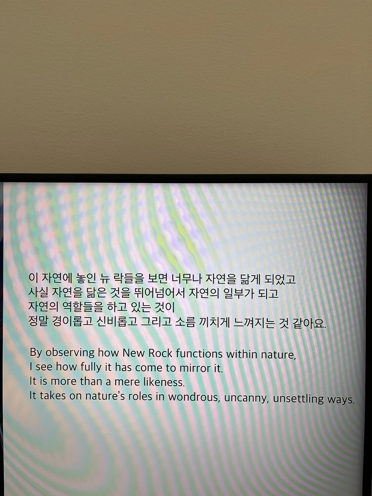 인간이 만든 인공교잡물이 마치 생명체처럼 인간의 삶에 침입해 들어오는 것에 두려움을 느낀다면, 그건 언젠가 그 침입자가 원인이 되어 나 자신이 소멸할 수 있을 거라는 공포심리가 의식 전반을 지배했기 때문에 나오는 본능적인 반응일 수도 있지 않을까. 하등하다고 인지하고 있던 보잘것없던 존재가 인간인 ‘나’와 비슷한 인격과 사고 능력을 탑재하고 조금씩 내 주위를 감싸면서 욱여 들어오면 섬뜩한 기분이 들 것 같기도 하다. 사실상 자연을 지배하고 있는 인간인 ‘나’의 위치가 역전당하는 것, 지배의 주체가 뒤바뀐다는 것에 대한 두려움이 원인일지도 모르겠다. 자연을 보호할 수 있는 것도 자연보다 우월한 위치에 있다는 지배자로서의 위치를 내심 긍정하고 있기 때문에 가능할 수 있는 게 아닌가 의심을 해볼 필요가 있을 것 같다.