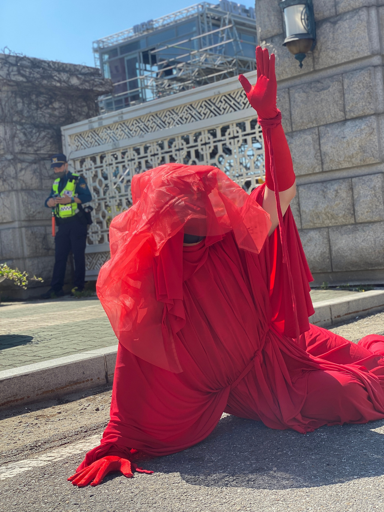 붉은 정령들(Red Rebel Brigade) 퍼포먼스는 2019년 영국에서 진행된 기후위기 대응 촉구와 멸종 반란을 위한 대규모 시위에서 비롯됐다. 내가 발 딛고 있는 공간을 적극적으로 지켜내고 돌보는 일, 그리고 나 역시 연루된 인류의 폭력으로부터 사라져가는 존재들을 위한 시위. 그로부터 시작된 퍼포먼스를 매개로 신내림을 한다니. 이보다 더 적절하고 뭉클할 수는 없었다.