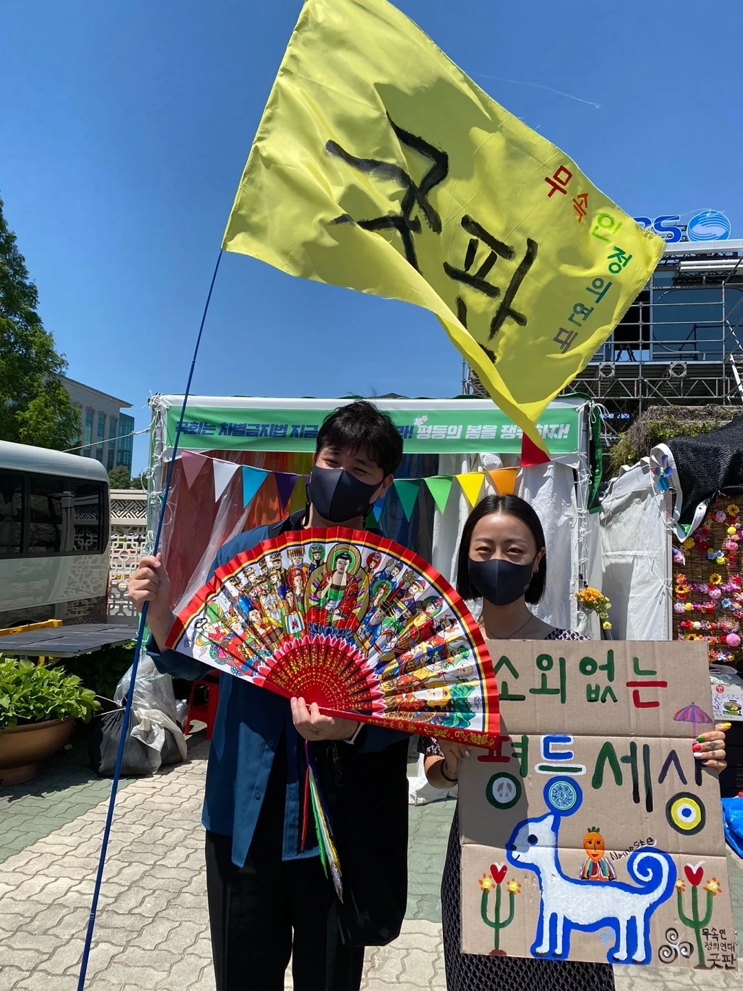 어린이날, 나는 신내림을 받았다. 장소는 계룡산, 태백산, 일월산도 아닌 국회 앞. 차별금지법 제정을 촉구하는 단식농성 현장이었다. 나의 ‘신선생님’은 퀴어무당 홍칼리. 집회 현장에 가기 전, 정성스레 준비한 음식과 의례 도구들, 각종 의식으로 나를 정화해주던 칼리는 말했다. “신내림을 일종의 자격이나 미신처럼 생각하는 사람들이 있어요. 그런데 우리 모두는 이미 신이고, 신내림은 하나의 의례에 불과해요. 만물에 신이 깃들어 있는걸요. 그래서 오늘은 만물을 되살리는 붉은 정령들 퍼포먼스를 함께 하며 신내림을 할 거예요. 우리 오늘 집회 현장을 굿판으로 만들고, 신명 나게 놀아 봐요.”