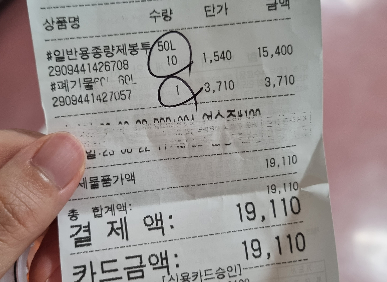 곤도 마리에 영상을 보고 집을 정리해 보기로 결심했습니다. 가장 먼저 한 일은 쓰레기봉투를 구매하는 것. 50리터짜리 쓰레기봉투를 10장 구매하고, 황색 쓰레기봉투도 60리터짜리로 하나 샀습니다. 인생 처음으로 쓰레기봉투 사는데 한 번에 19000원을 소비했습니다.