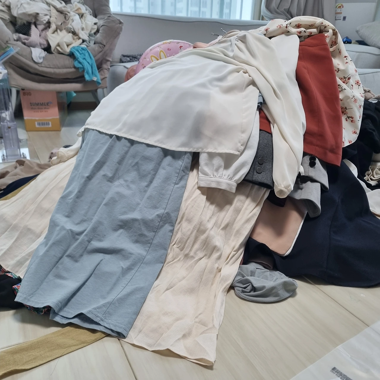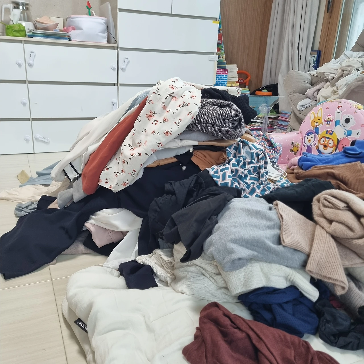 집에 있는 모든 옷을 싹 다 꺼내서 거실에 쌓아봅니다. 나중에 나오는 옷이 있으면 모조리 버린다고 생각하고 여기저기에 흩어져 있는 옷들을 모아봅니다. 제가 꺼낸 옷은 이 정도입니다. 옷이 없다고 생각했는데도 무릎 높이는 쉽게 넘습니다.
