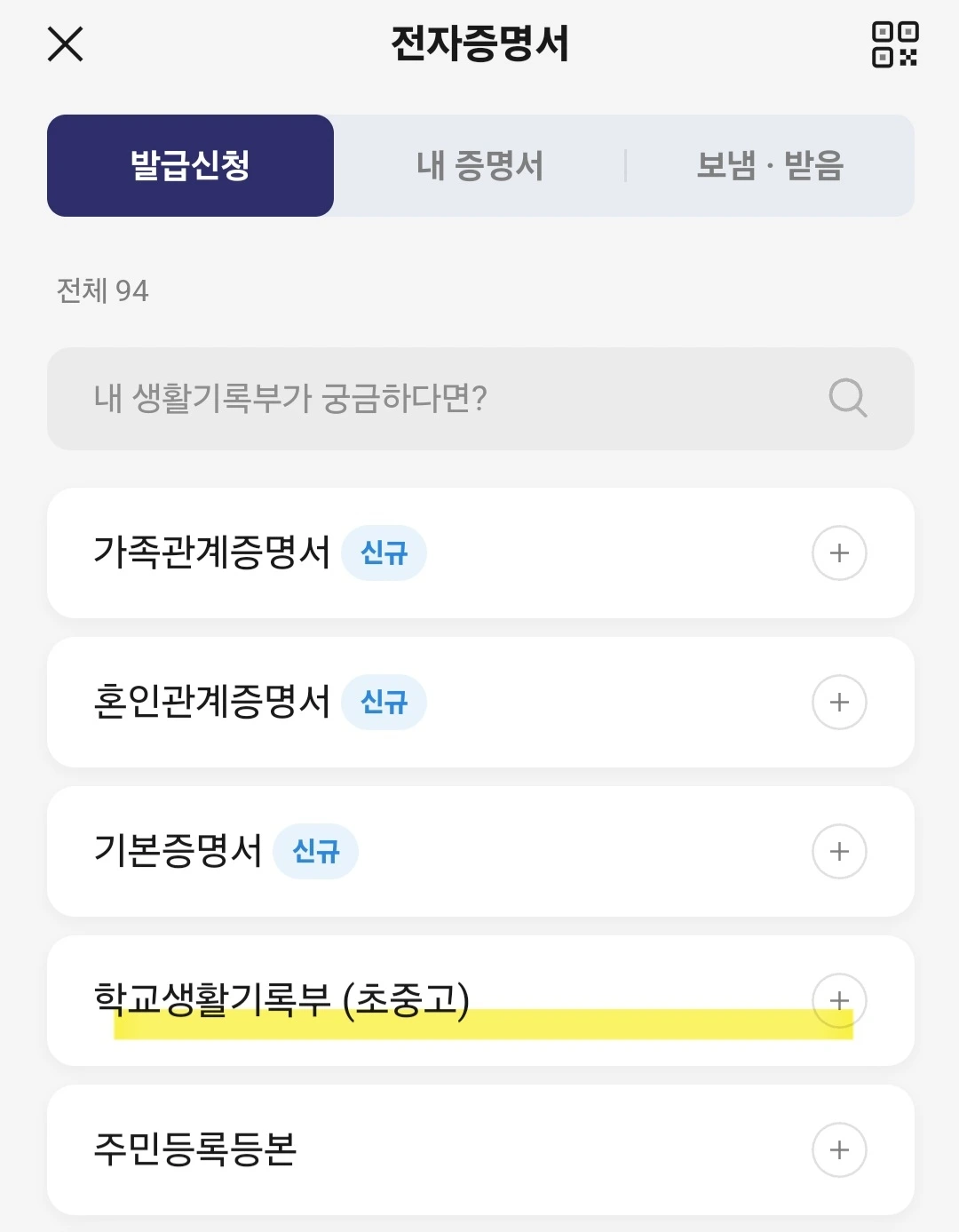 그중에 새로 생겼다는 '학교 생활기록부(초중고)'를 눌러본다.
