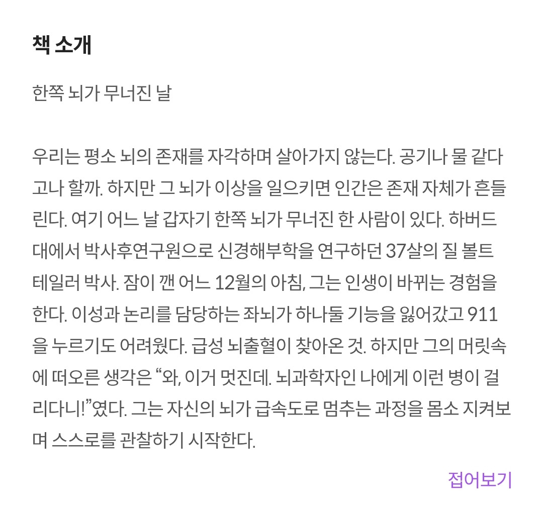 평소 우리는 좌뇌와 우뇌의 결합으로 매끄럽게 하루를 살아간다. 작가는 좌뇌의 기능이 멈췄을 때 그 모든 것을 잃어버리는 경험이 결코 공포스럽지 않았음을 이야기한다.