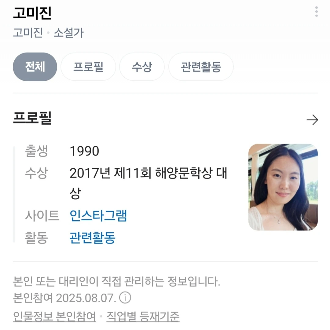 등록 신청한 정보는 두 가지이다. 2017년에 받았던 제11회 해양문학상 대상. 6명이 함께 묶어서 책을 낸 단편소설집 한 권. 이 두 가지 정보로 네이버는 나를 '소설가'로 등록시켜 주었다.