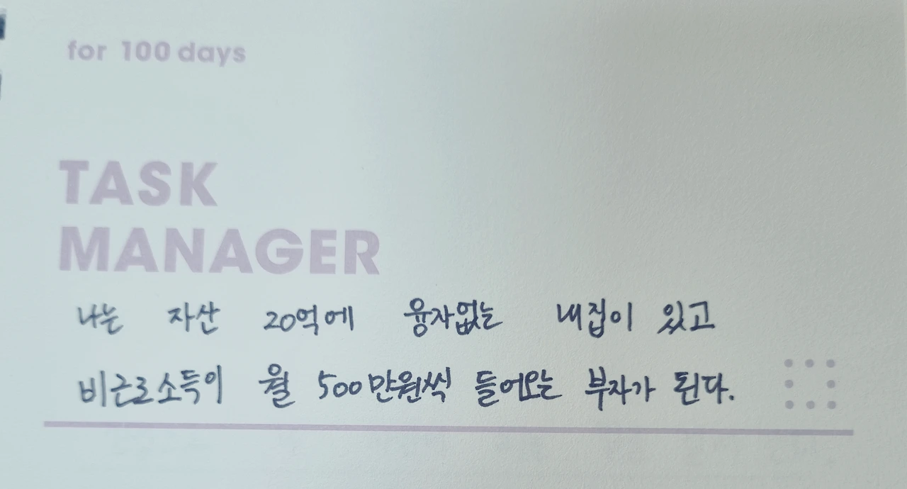 하지만 경제적 자유를 누릴 정도로는 부자이고 싶어요. 이 세상에 태어나서 부자로 살아보는 것! 너무 매력적이지 않나요? 무언가를 할 때 돈 걱정을 하지 않아도 되면 좋겠습니다. 특히 내가 사랑하는 가족이 아플 때 선뜻 병원비를 건넬 수 있으면 좋겠어요.