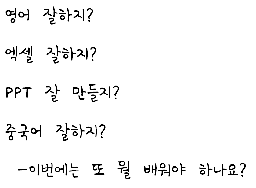 입사하고 나서 영어 잘하는지, 엑셀 할 줄 아는지, PPT 잘 만드는지 물어보신다.