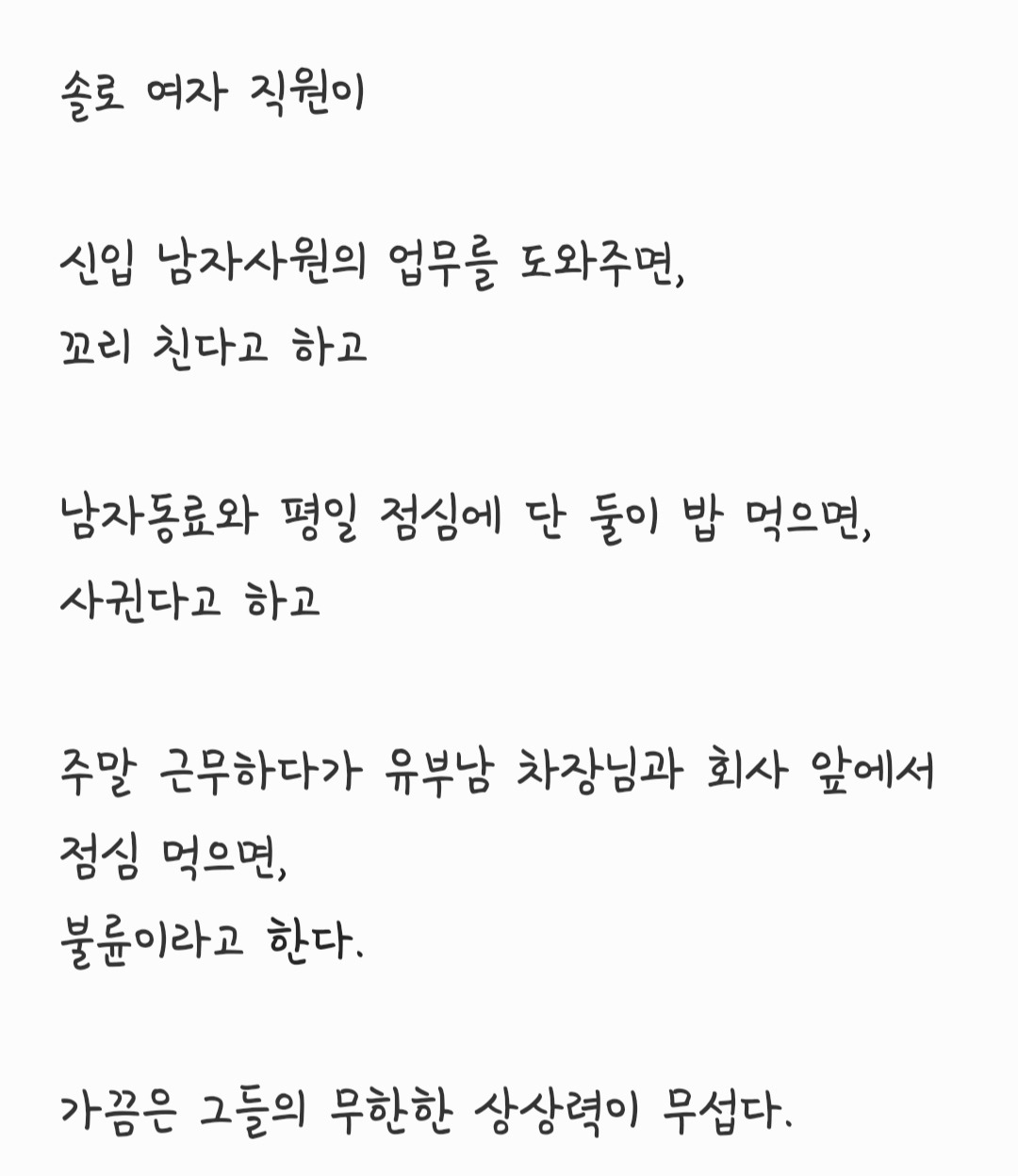 차장님과 주말 근무하다가 회사 앞에서 점심을 먹었는데 불륜이라고 회사 내에 소문났다.