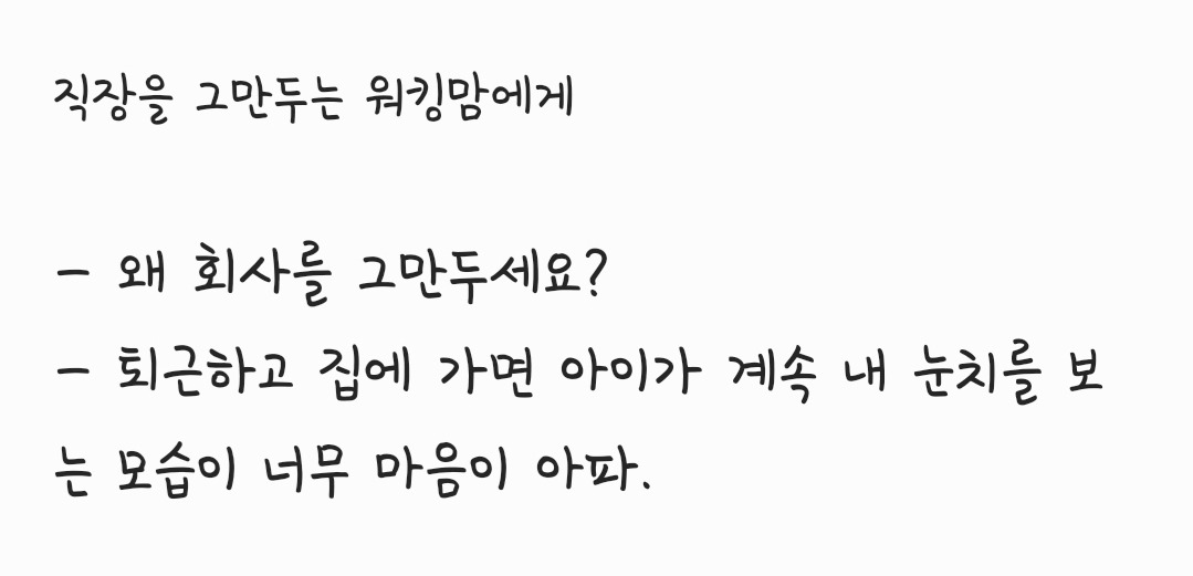 어느 날 워킹맘 대리가 퇴근 후 집에 갔더니 엄마를 반기기보단 눈치를 보는 아이를 보고 마음이 너무 아파서 그만둔다고 한다.