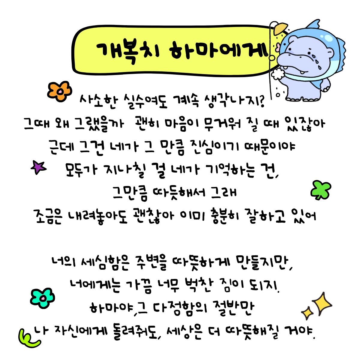 내 마음속 걱정거리들을 흡수시키는 '고민먹는 하마'가 있음 참 좋겠다!