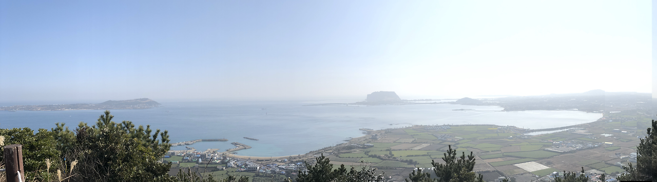 지미봉으로 향하는 길은 제법 가파르다. 경사가 급한 길일수록 상체를 앞으로 굽히지 않아야 덜 힘들다. 마치 등을 누군가가 밀어주는 느낌을 만끽하는 편이 좋다. 숨이 가쁠수록 숨은 뱉어낸다. 숨이 가득 찼으니 마시기 전에 뱉어내는 일, 그 일이 이른바 숨이 찰 때 해야 할 일이다. 그렇게 숨을 뱉어내며 지미봉 정상에 올라서니 비록 미세먼지로 사방은 뿌옇지만, 성산일출봉과 우도, 토끼봉뿐만 아니라 뉴욕제과 롤케이크 같은 파스텔톤의 밭과 땅이 한눈에 든다.