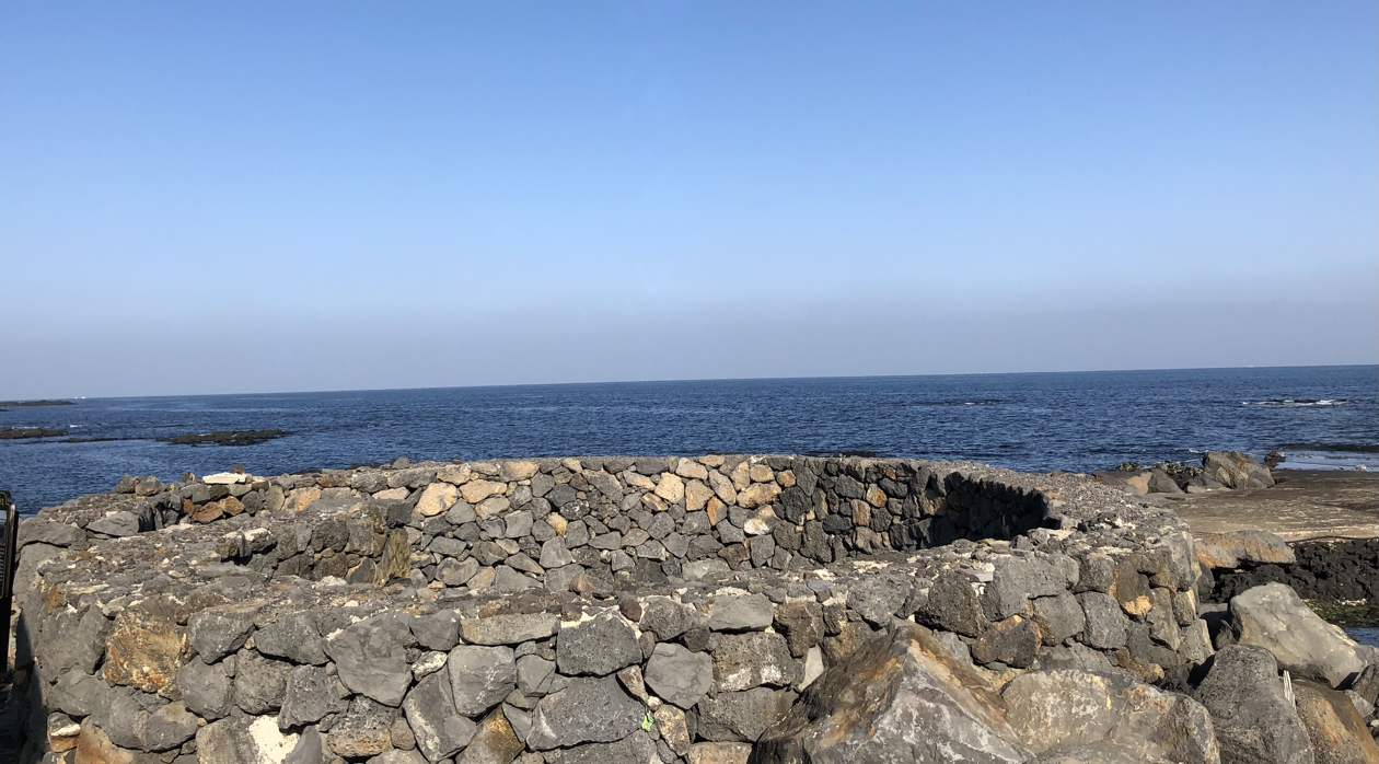 바다와 마을길을 넘나드는 이 길은 해녀의 발자취를 따라가는 길이기도 하다. 당근밭과 아직 만개하지 않은 유채꽃밭을 따라 걷다 보면 해녀와 어부의 무사 안녕을 기원하는 해신당인 각시당을 만난다. 21코스의 중간 스탬프 지점인 석다원을 지나 하도 해수욕장에 이르는 해안길 중간에는 해녀 불턱이 있다. 불턱은 해녀들이 옷을 갈아입거나 언 몸을 녹이기 위해 바닷가에 돌담을 쌓아 만든 공간이라고 한다. 불턱 사진을 찍어 친구에게 보내니 친구는 이렇게 답한다.