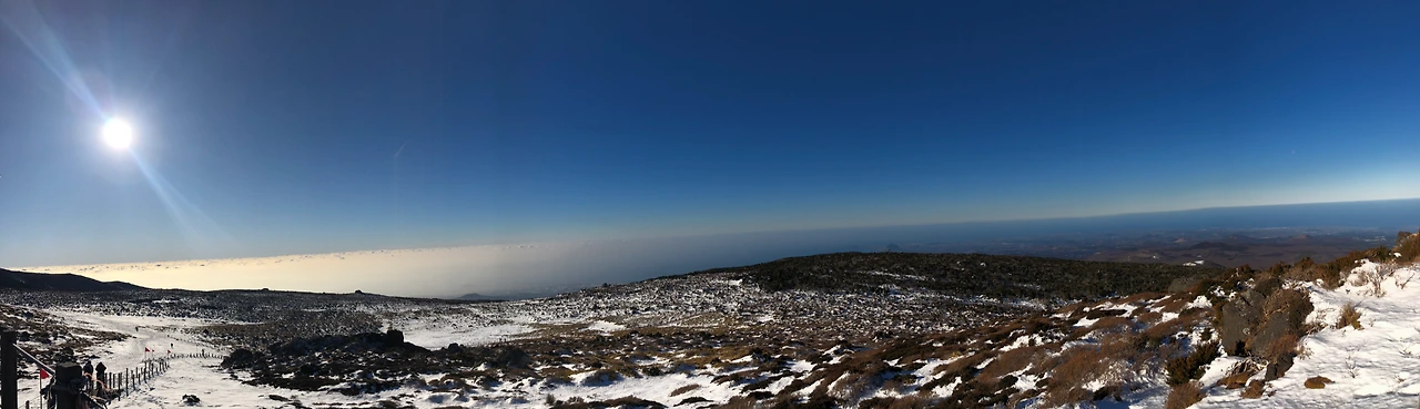 윗세오름 대피소에 도착했을 때, 살짝 바람이 매서웠지만 염려할 정도는 아니었어. 나에겐 택시에 오르기 전 편의점에서 구입한 에너지바와 어제 찌니로부터 건네받은 된장차 그리고 올레 시장에서 구입한 귤이 있었지. 스패츠와 아이젠 그리고 등산화까지 모두 벗어버리고 양말을 갈아 신었어. 최근 알게 된 꿀팁! 장시간 도보 여행이나 산행 중간에 양말을 갈아 신으면 물집이 생기는 걸 예방할 수 있대! 폼 나는 게 중요한 나는 전문산악인 포스로 양말 체인지를 하고 우아하게 된장차를 마셨단다!