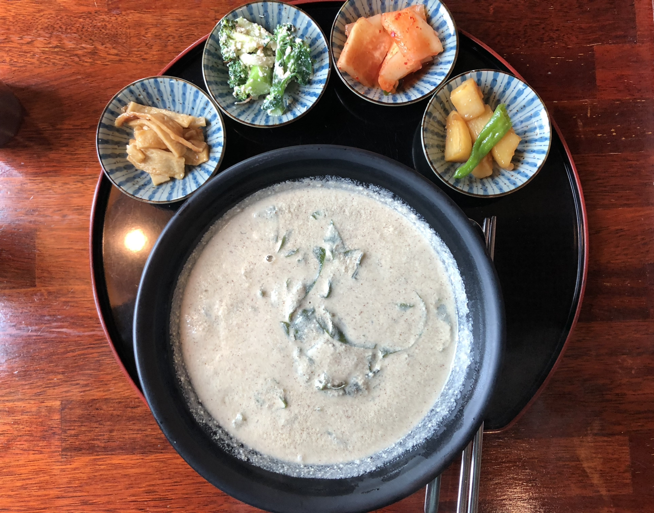 하지만 돌아가면 되니, 거기에 또 길이 있으니 얼마나 다행이야. 그래서 패기 있게 뒤로 돌아 다시 목적지를 향해 걷고 있어. 목적지가 어디냐고? 오조리에 있는 식당이야. 들깨쑥떡국 먹으러 가는 길! 해물과 흑돼지 일색인 제주에 들깨쑥떡국을 파는 곳이 있다고 해서 일부러 찾아왔어. 배낭을 내려놓고 신발 끈도 느슨하게 푼 다음, 성스러운 마음으로 들깨쑥떡국을 기다리는 중이야. 짜잔~ 들깨를 손수 갈아냈음이 틀림없는 뽀얀 국물에 쫄깃쫄깃한 쑥떡국이 잠겨 있구먼! 반찬은 또 얼마나 정갈하고 맛나는지. 플레이팅도 해랑이 마음에 쏙 들 걸! 싹싹이 주걱이 있다면 더 말끔히 비워내고, 발우공양을 하고 싶은 심정이었어.