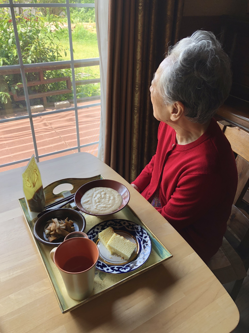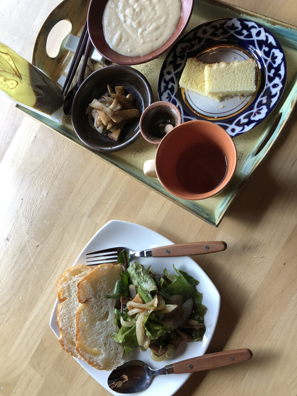오늘 아침은 감자수프다. 어제 삶아 호호 불어가며 껍질을 벗겨 먹은 감자가 두 세알 남았다. 양파와 마늘을 올리브유에 볶다가 두유와 삶은 감자를 넣어 으깨듯 저어준다. 약간의 소금과 후추가 감칠맛 담당이다. 엄마식탁엔 감자수프와 카스텔라를 내고, 나는 텃밭 채소에 발사믹 소스와 국간장, 매실청을 끼얹어 빵에 끼워 먹는다. 찬 샐러드를 먹을 때 익은 채소를 곁들이면 좋다. 프라이팬에 버섯과 양파를 기름 없이 볶는다. 버섯과 양파에서 나오는 수분이 기름을 대신한다. 역시 감칠맛 담당은 소금과 후추다.