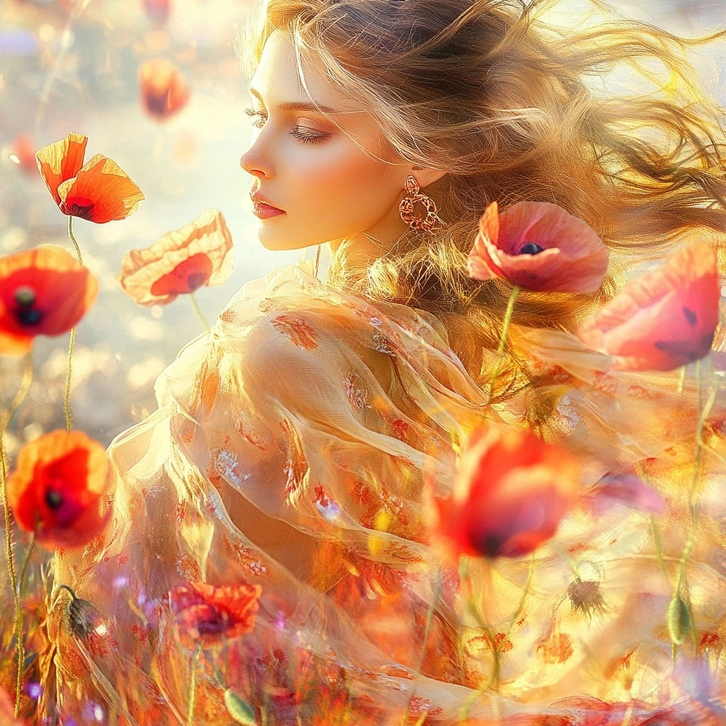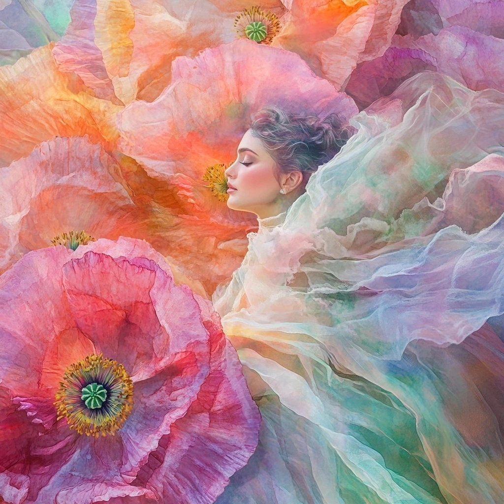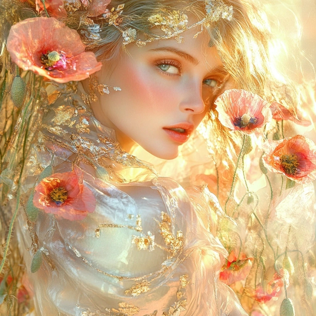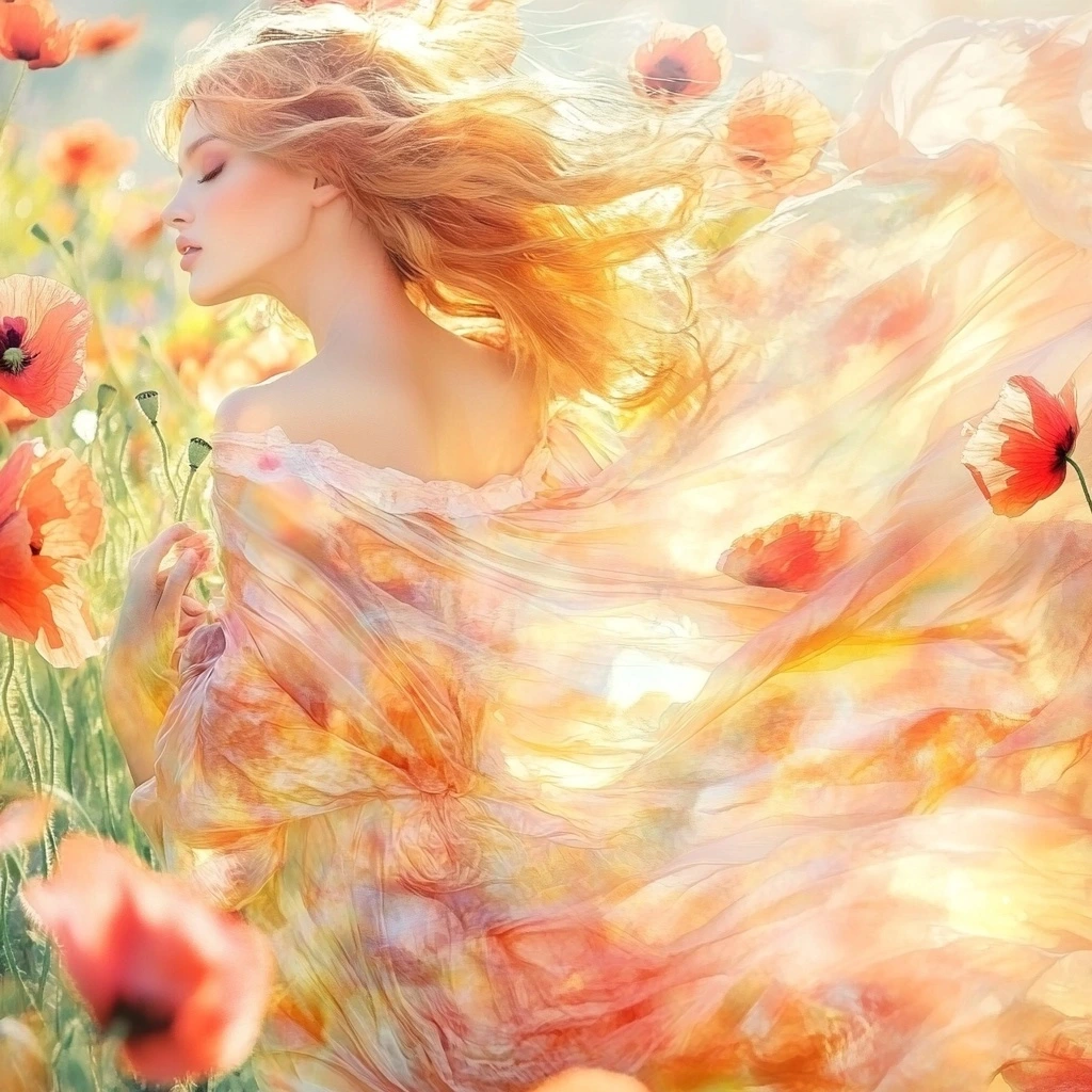 A woman intertwined with poppy flowers bathed in golden morning light, soft watercolor style, warm pastel tones, translucent silk dress, peaceful and elegant atmosphere