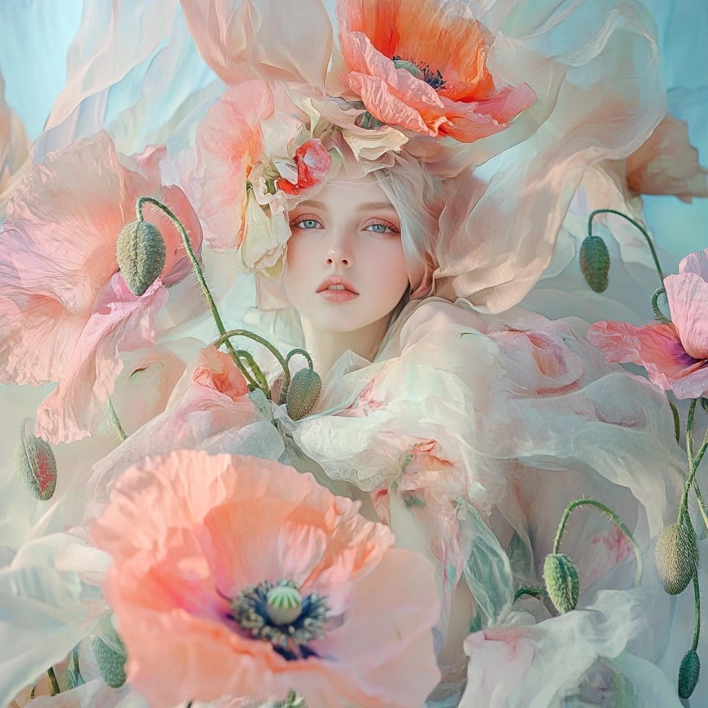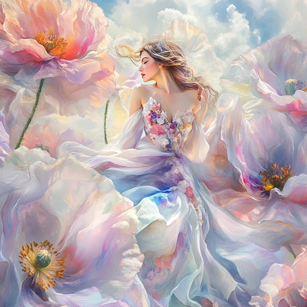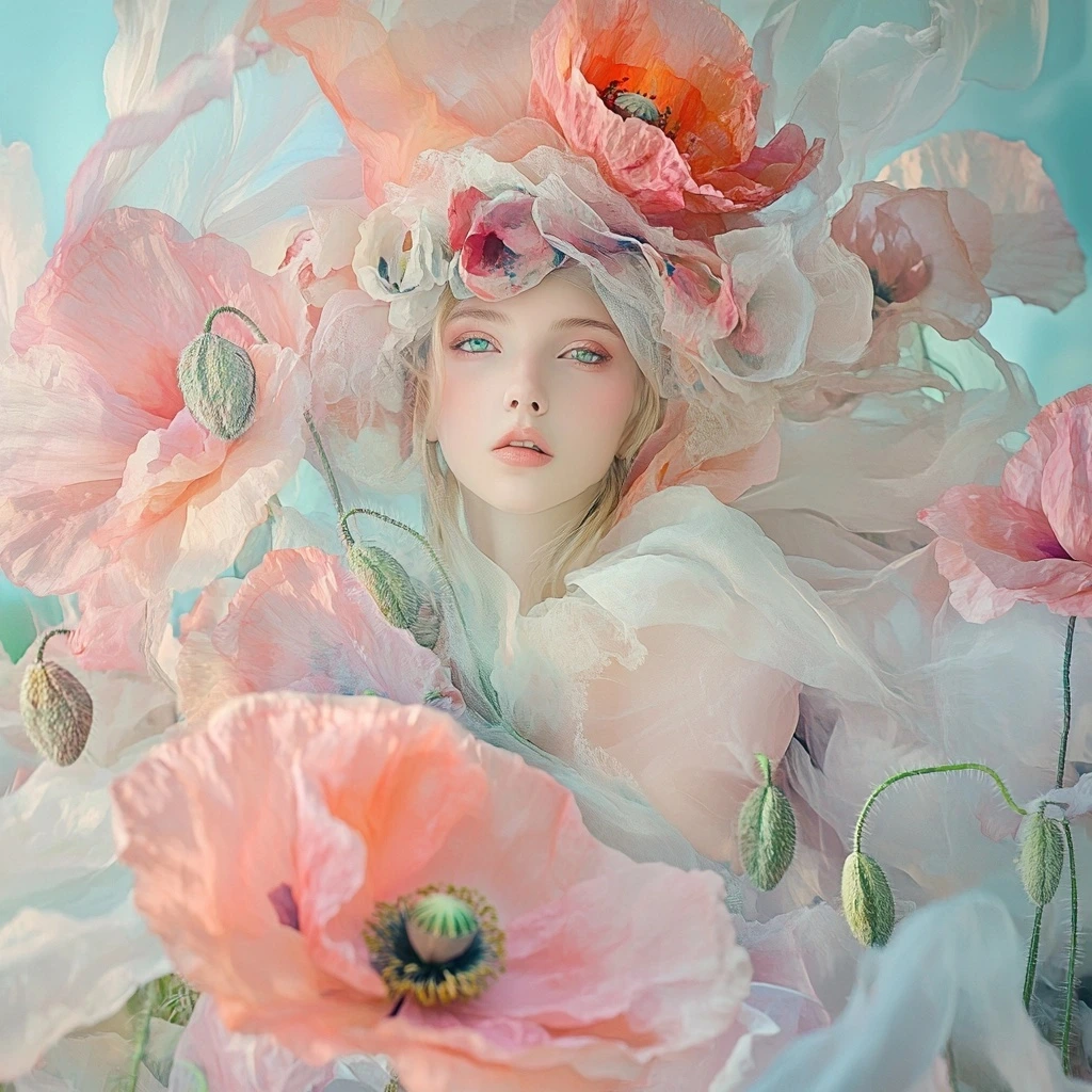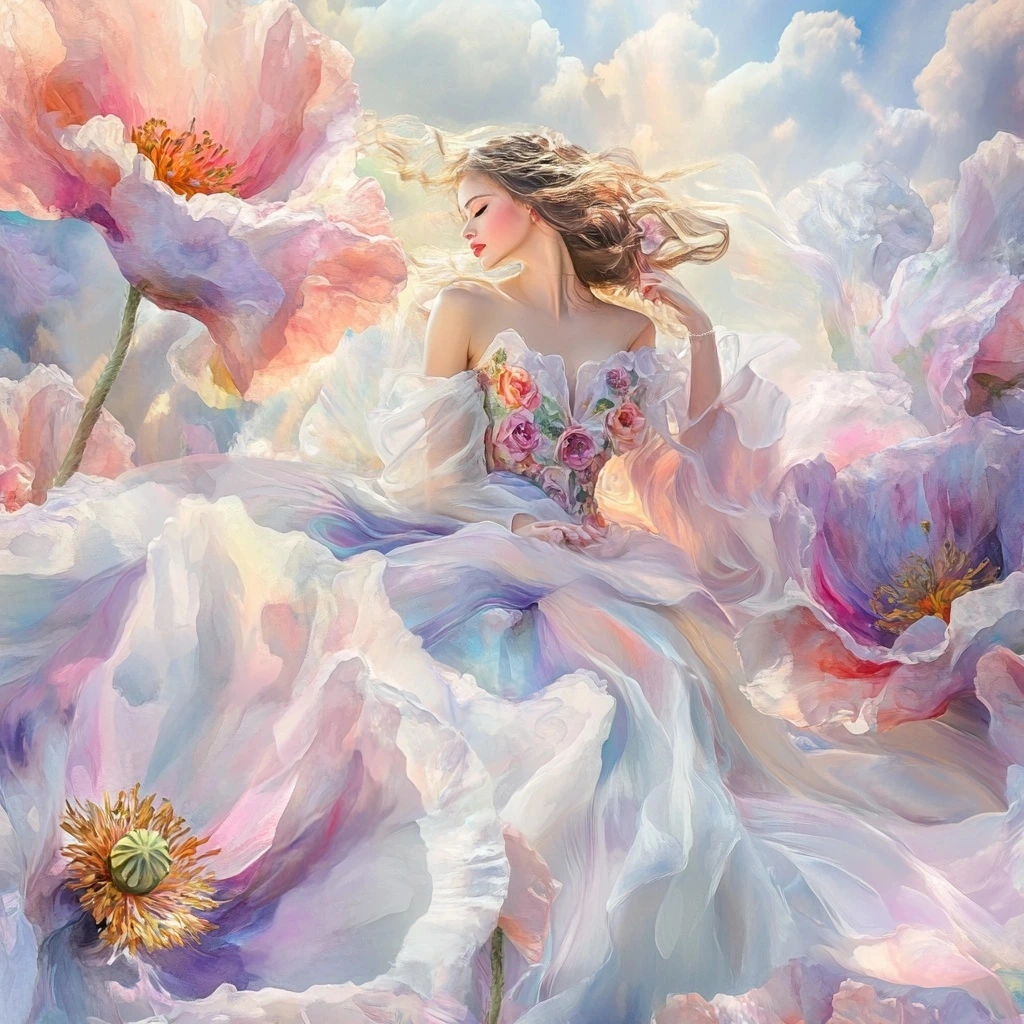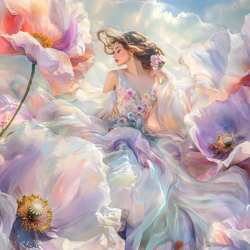 A woman intertwined with poppy flowers bathed in golden morning light, soft watercolor style, warm pastel tones, translucent silk dress, peaceful and elegant atmosphere