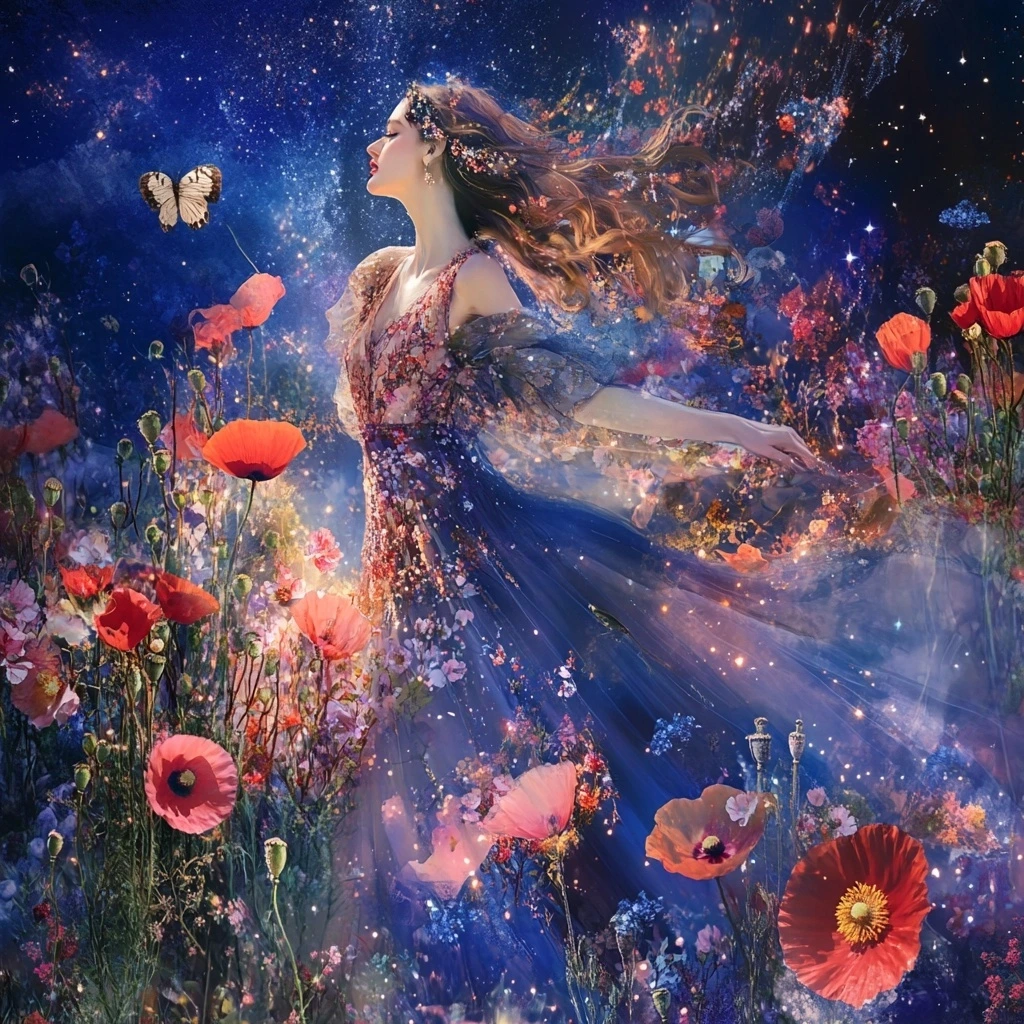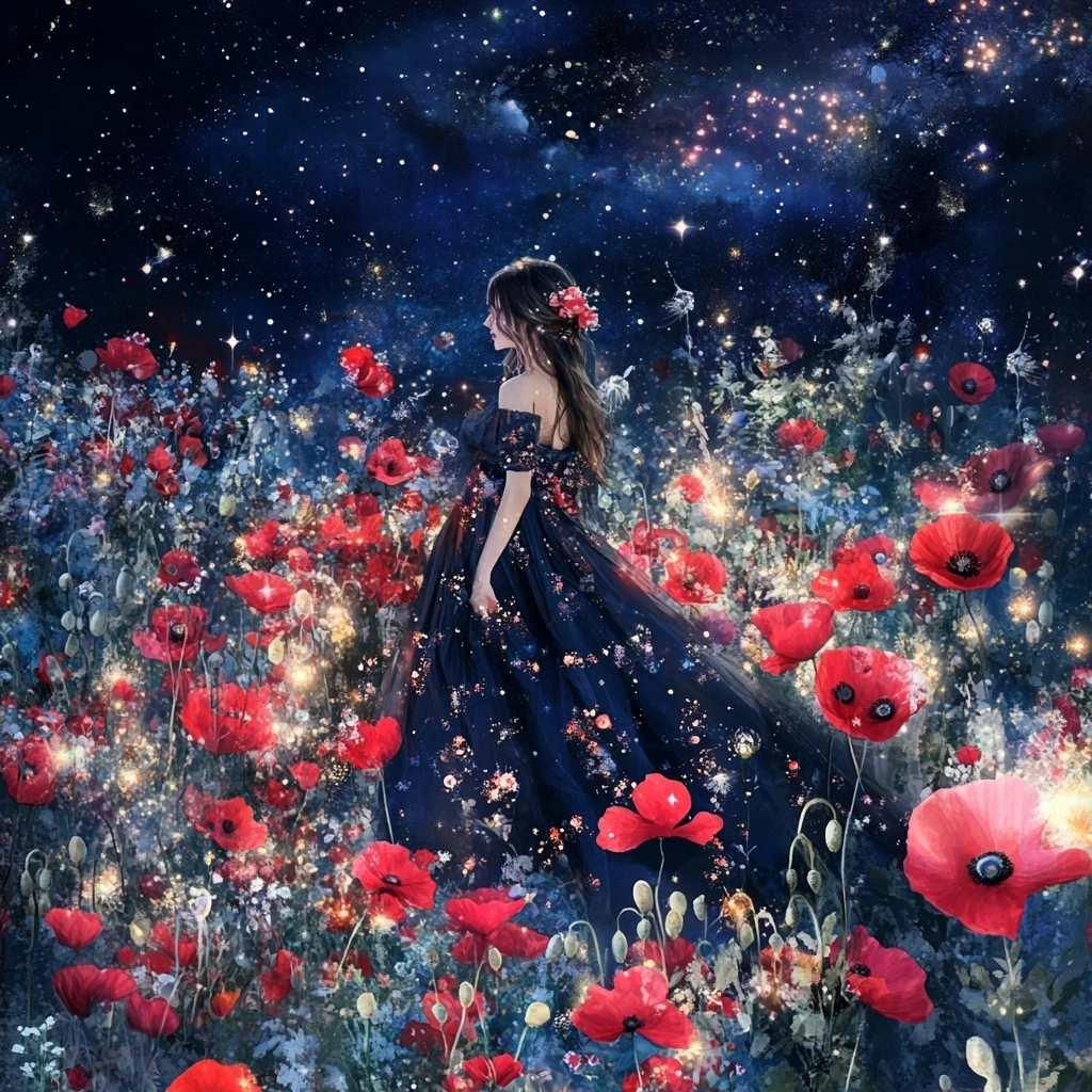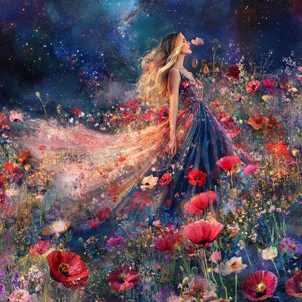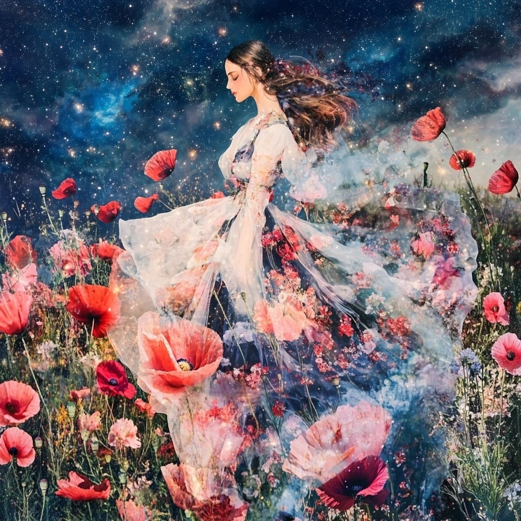 A graceful woman blending into blooming poppy flowers under a starry night sky, watercolor effect, soft glow, dreamy and ethereal mood, flowing transparent dress, deep navy and soft crimson palette