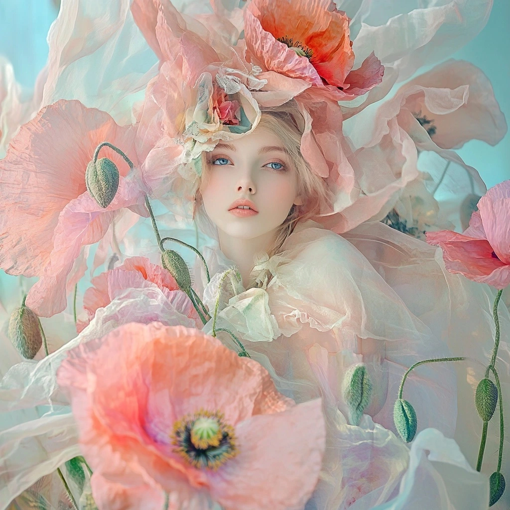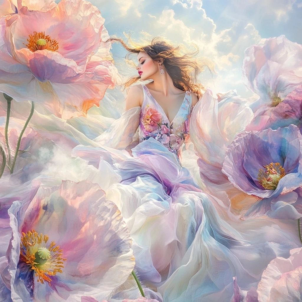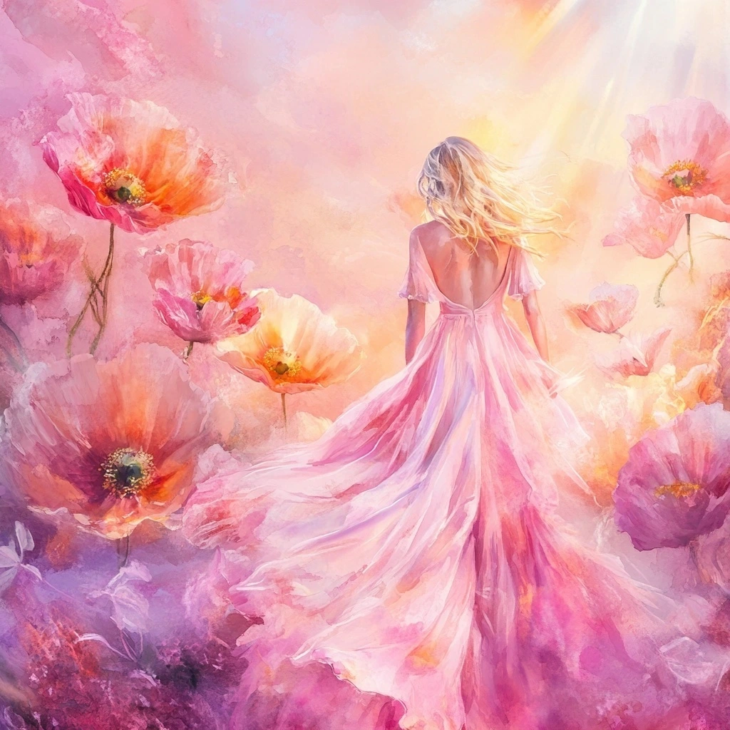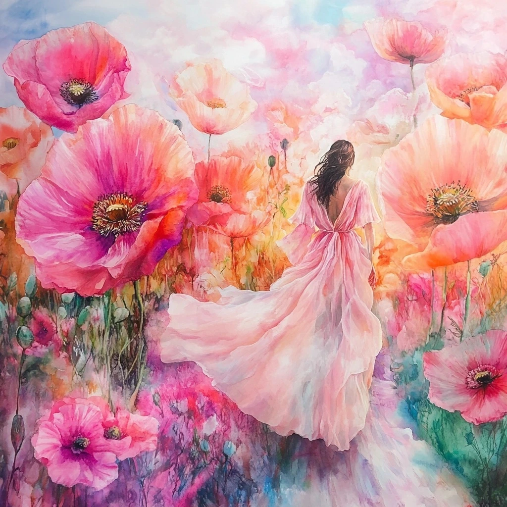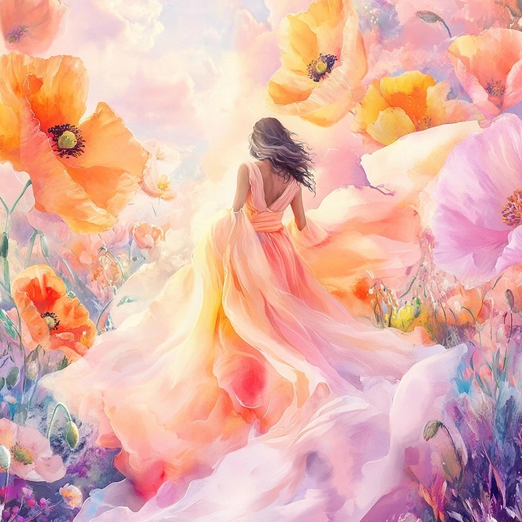 A surreal woman walking through pink mist and giant blooming poppies, dreamy watercolor illustration, flowing chiffon gown, soft pinks and oranges, emotional and poetic composition