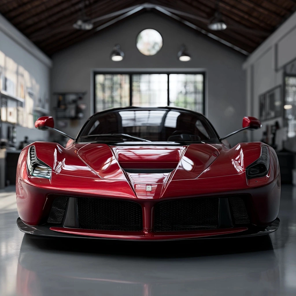 차고 한복판에서 빛을 머금은 레드 페라리, 유럽 골목길을 조용히 차지한 블랙 부가티, 붉은 조명 아래 더 강렬해진 미래형 스포츠카까지.