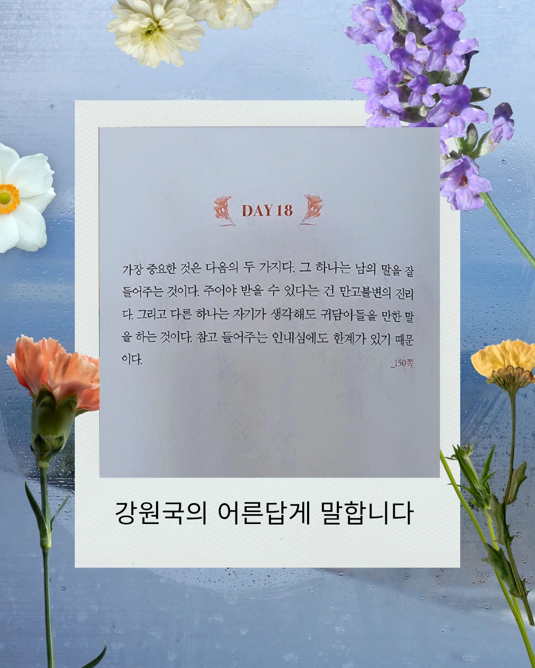 상대의 마음을 읽고, 말 너머의 감정에 다가가는 일이다. 말은 마음의 문을 여는 열쇠일 수 있고, 때로는 마음을 다치게 하는 칼이 될 수도 있다. 그래서 진심으로 들어주는 자세는 곧 마음을 주는 행위다. ‘주어야 받을 수 있다’는 말은 이보다 더 잘 어울릴 수 없다. 진심으로 귀 기울일 때, 비로소 우리는 누군가의 신뢰와 마음을 받을 수 있다.