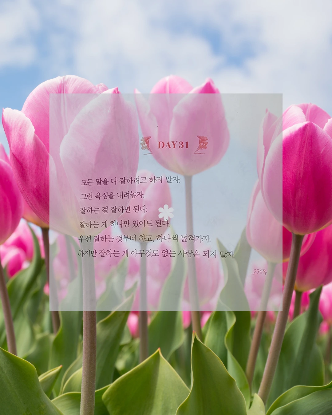 그러니 잘하고 싶은 게 있다면, 하나라도 확실히 해보자. 그것이면 충분하다. 대신 아무것도 하지 않고, 아무것도 잘하지 않는 사람은 되지 말자. 내 안의 작은 가능성을 믿고, 한 걸음씩 걸어가보자.