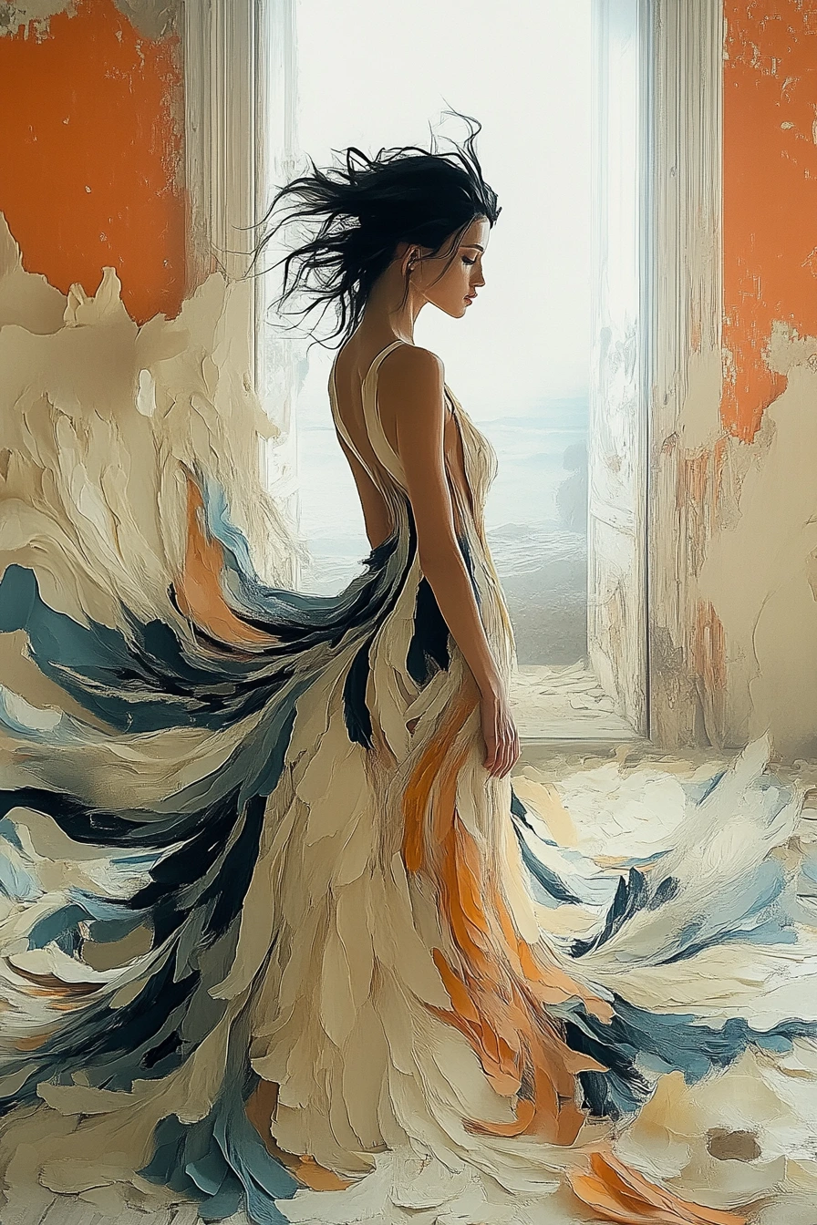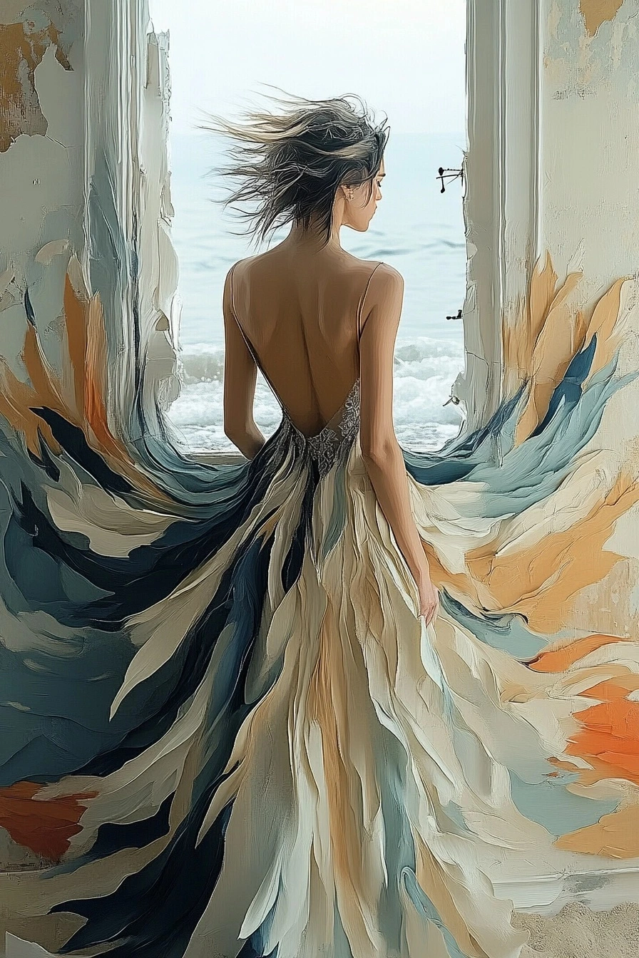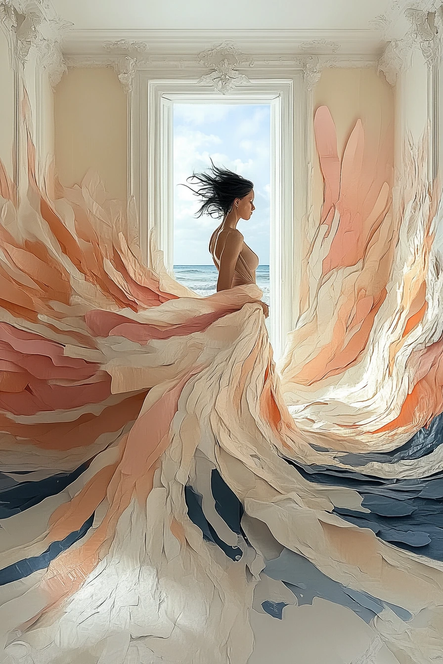 버려진 신고전주의 살롱에서의 jil sanders 패션 편집, 아름답게 흐르는 가운, 바닥의 해변 모래, 쏟아지는 바닷물, 미니멀리스트 패션 디자인, 잃어버린 장소, 파스텔 색상, 완벽한 조명, vogue 매거진, longong 테마, cgi, vfx, sfx, after effects