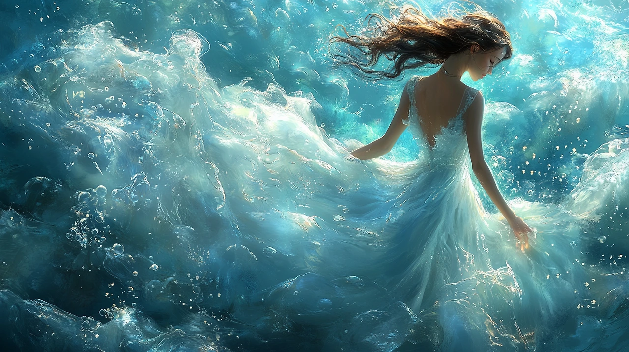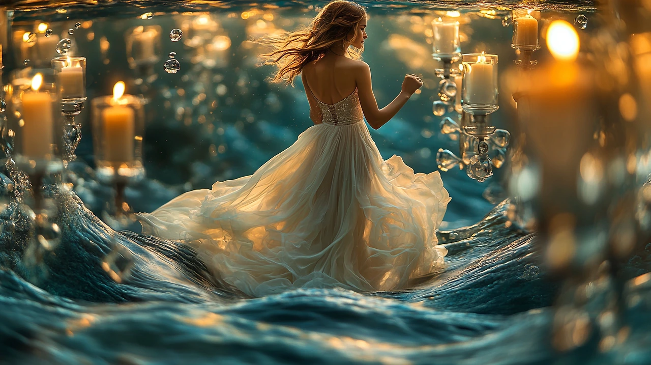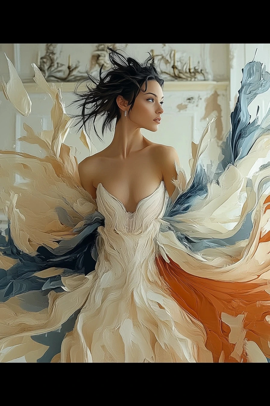 버려진 신고전주의 살롱에서의 jil sanders 패션 편집, 아름답게 흐르는 가운, 바닥의 해변 모래, 쏟아지는 바닷물, 미니멀리스트 패션 디자인, 잃어버린 장소, 파스텔 색상, 완벽한 조명, vogue 매거진, longong 테마, cgi, vfx, sfx, after effects