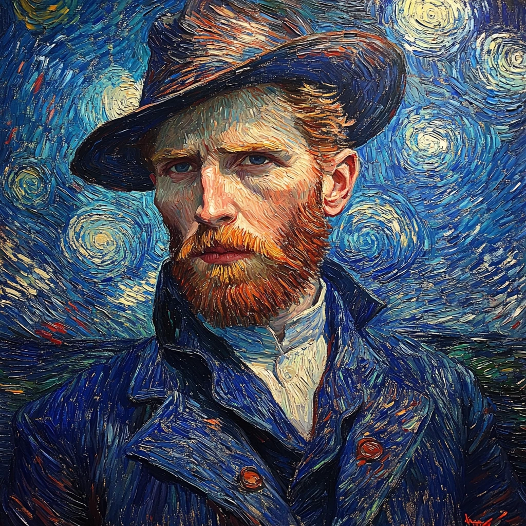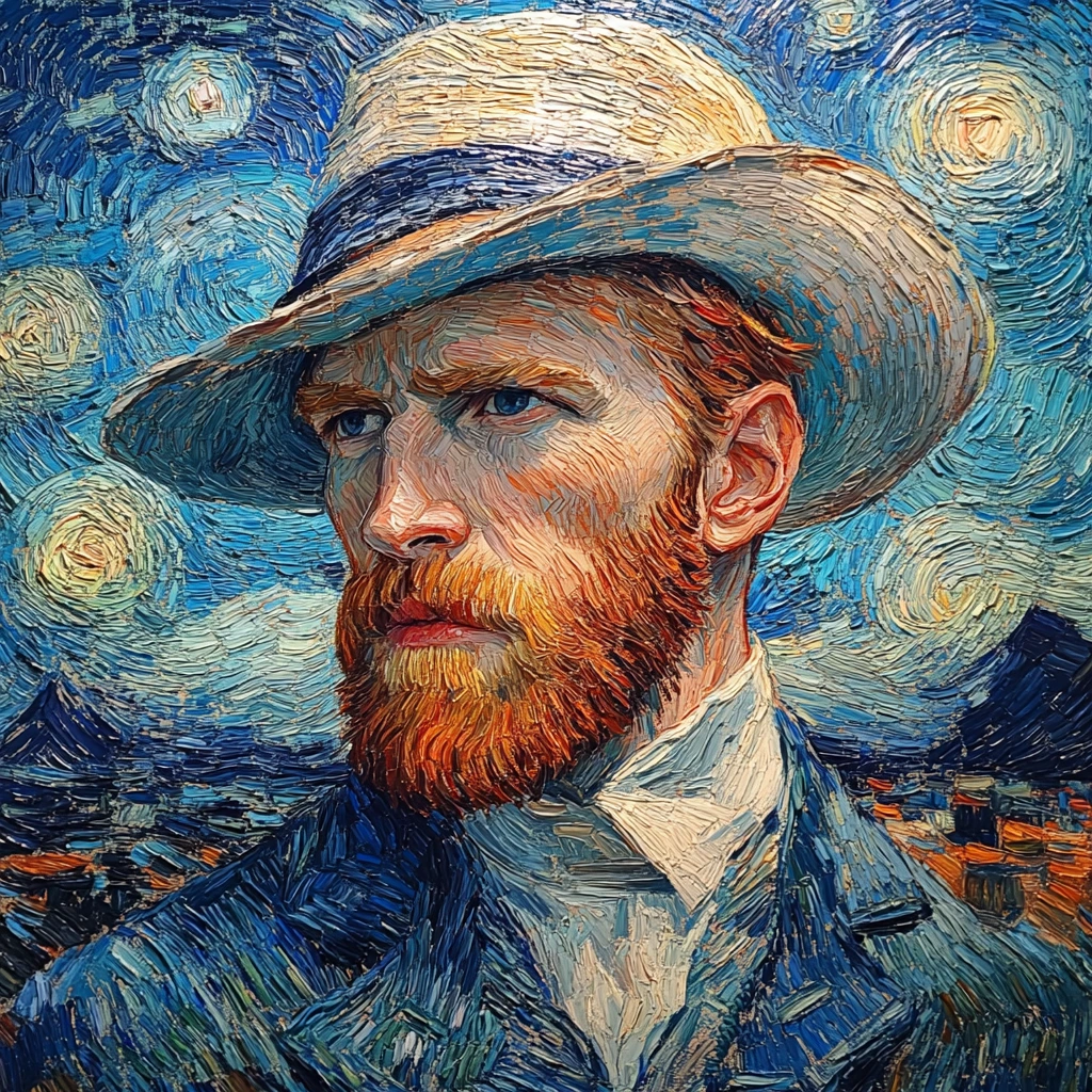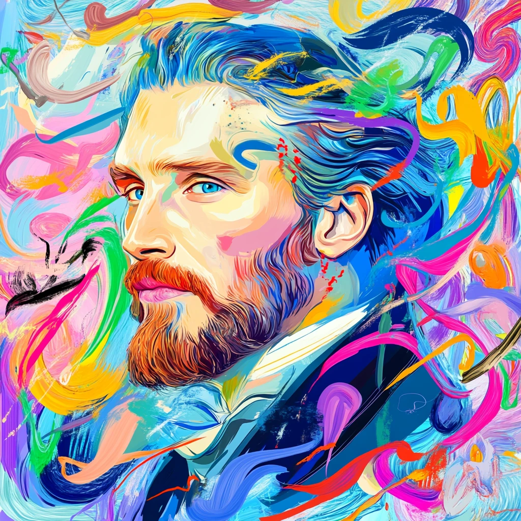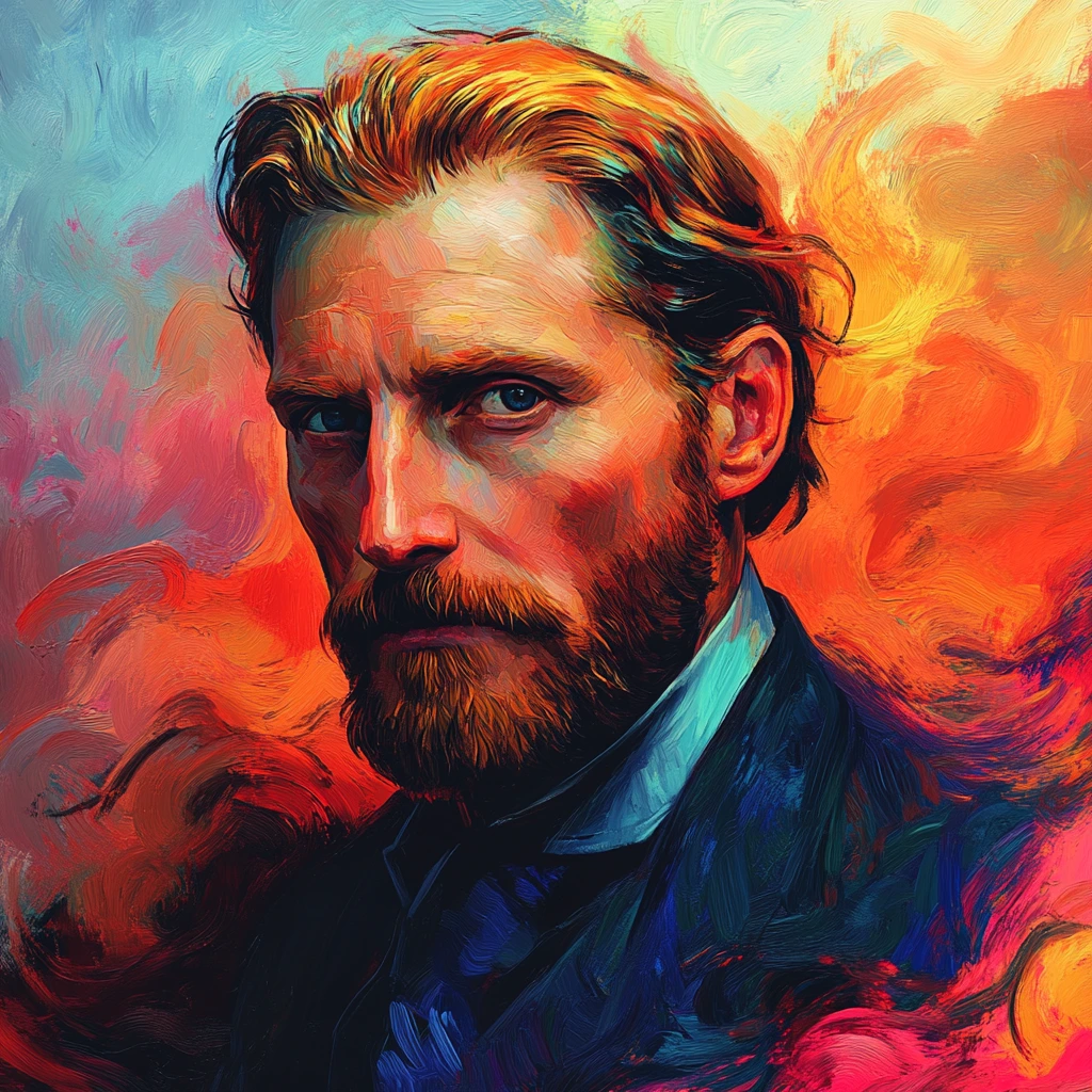 프롬프트: "A digital portrait of Vincent van Gogh, created in his post-impressionist style with swirling, vibrant brushstrokes and bold colors, capturing the intensity and emotion of his iconic works." "포스트 인상주의 스타일로 표현된 빈센트 반 고흐의 디지털 초상화. 소용돌이치는 강렬한 붓질과 대담한 색채로 그의 대표 작품의 감정과 강렬함을 담은 이미지."