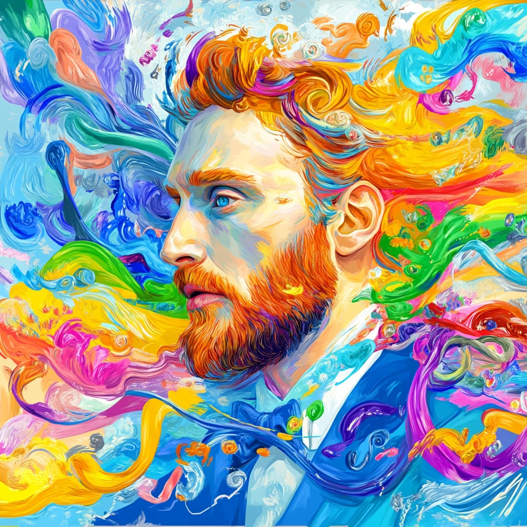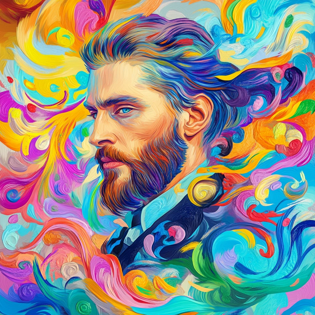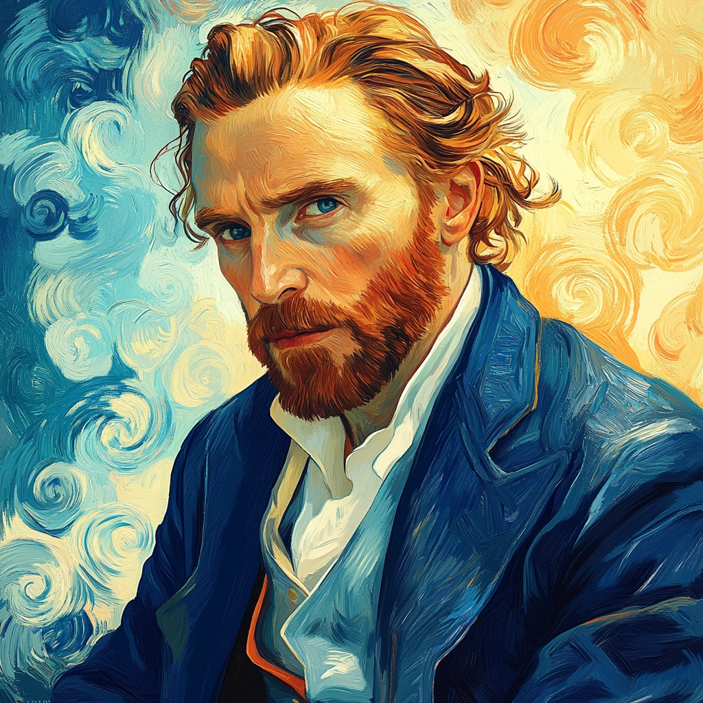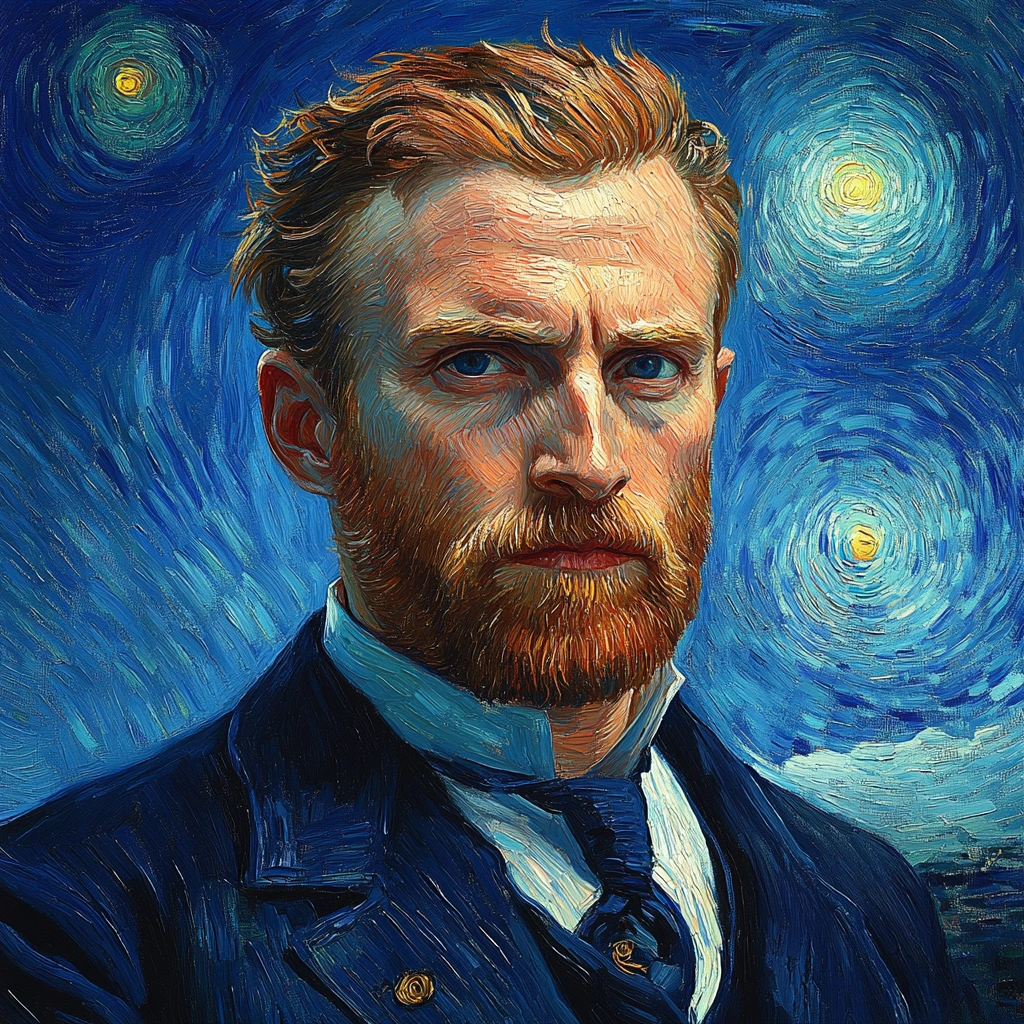 프롬프트: "A digital portrait of Vincent van Gogh, created in his post-impressionist style with swirling, vibrant brushstrokes and bold colors, capturing the intensity and emotion of his iconic works." "포스트 인상주의 스타일로 표현된 빈센트 반 고흐의 디지털 초상화. 소용돌이치는 강렬한 붓질과 대담한 색채로 그의 대표 작품의 감정과 강렬함을 담은 이미지."