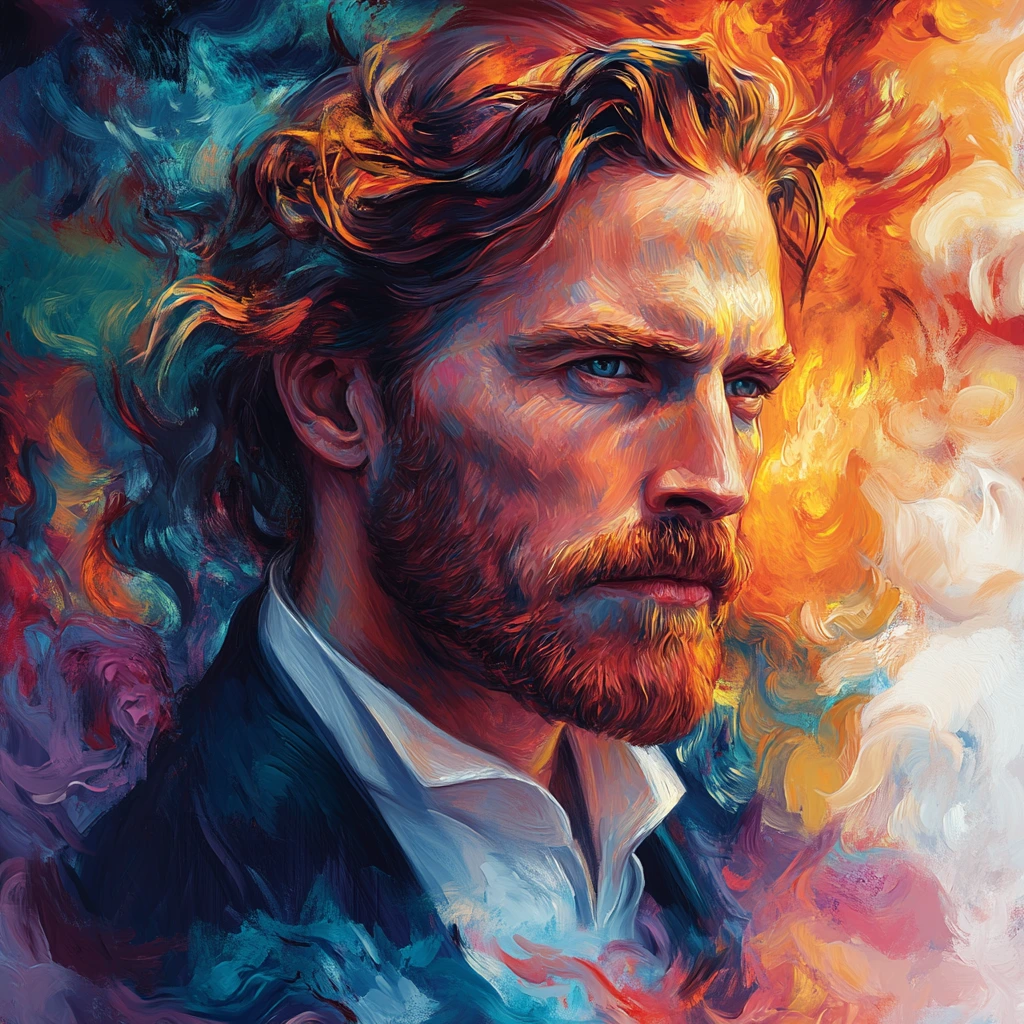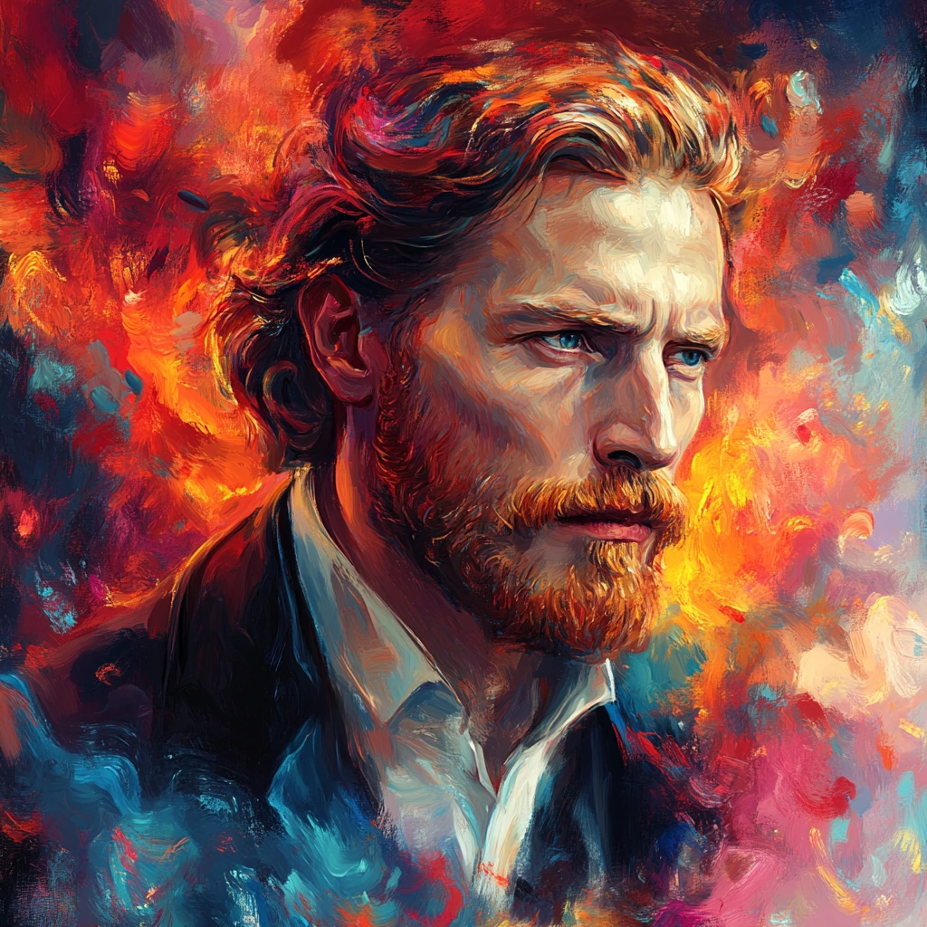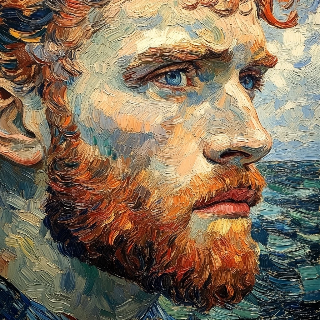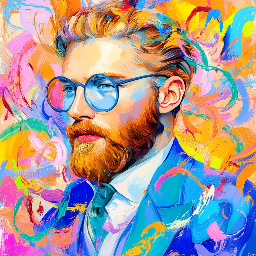 프롬프트: "A digital portrait of Vincent van Gogh, created in his post-impressionist style with swirling, vibrant brushstrokes and bold colors, capturing the intensity and emotion of his iconic works." "포스트 인상주의 스타일로 표현된 빈센트 반 고흐의 디지털 초상화. 소용돌이치는 강렬한 붓질과 대담한 색채로 그의 대표 작품의 감정과 강렬함을 담은 이미지."