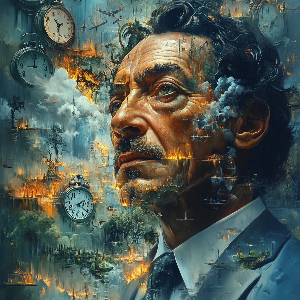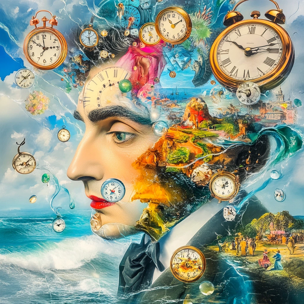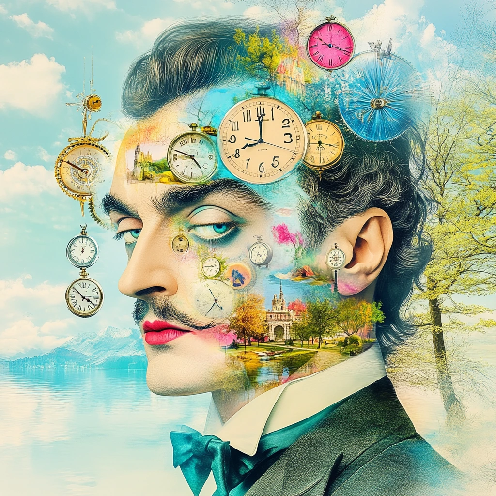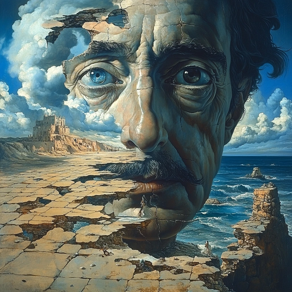 살바도르 달리는 그의 초현실주의 스타일을 담아 녹아내리는 시계와 기괴한 풍경이 얼굴과 뒤섞여 환상적인 이미지를 만들어냈습니다.