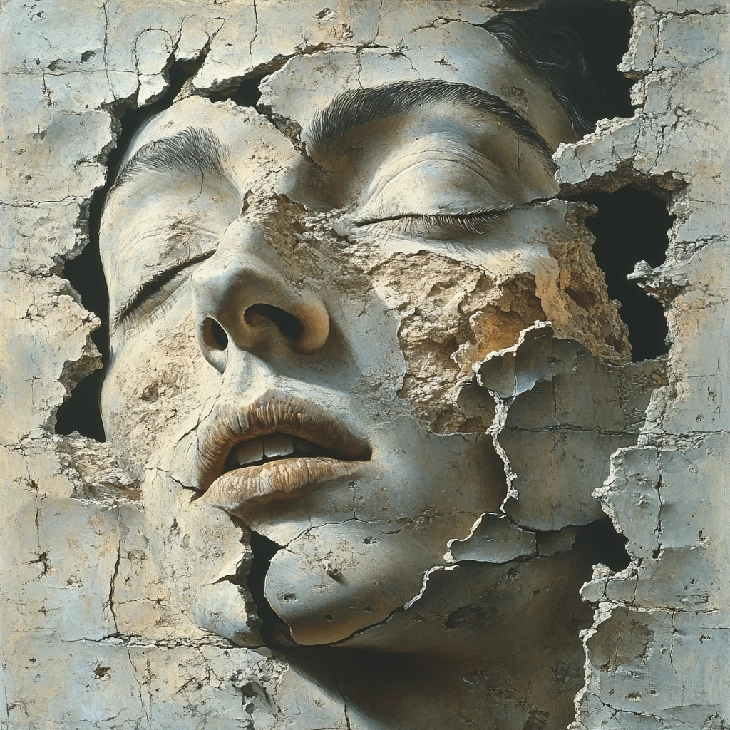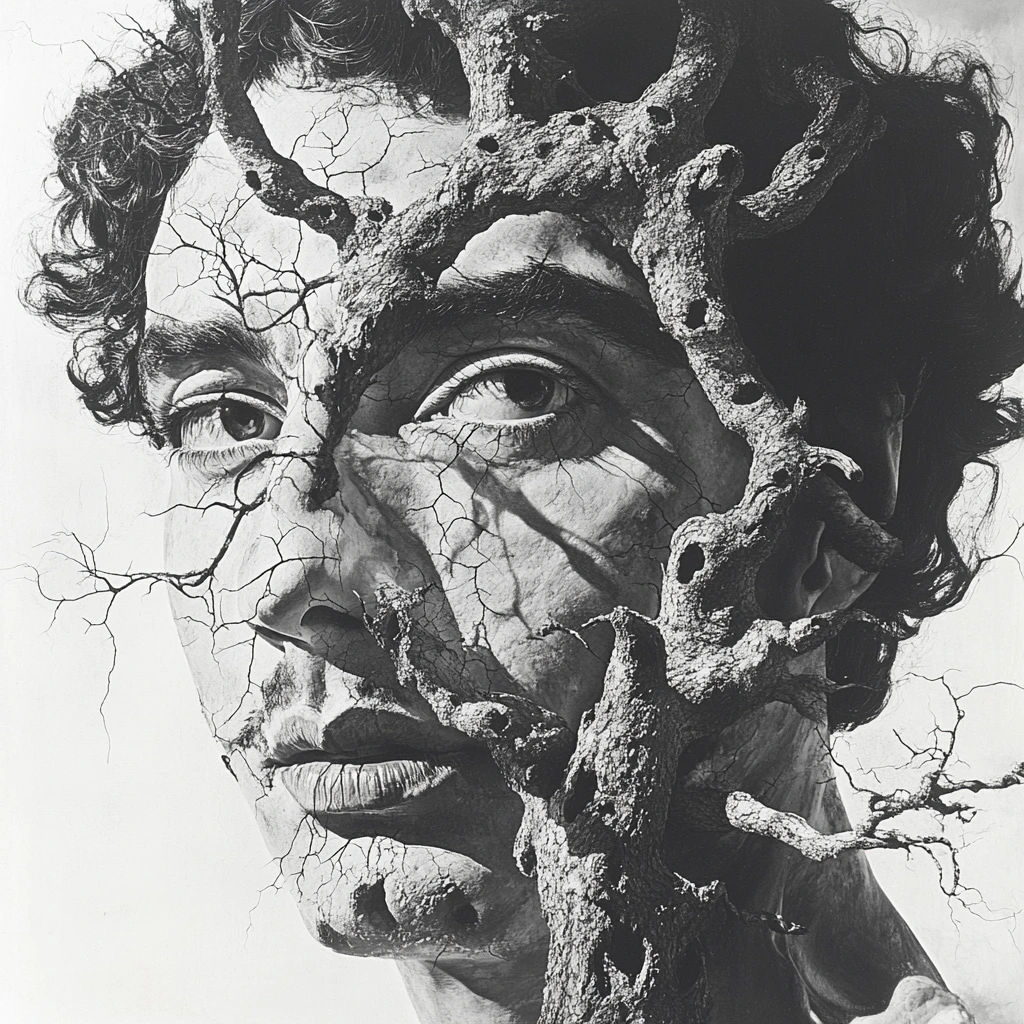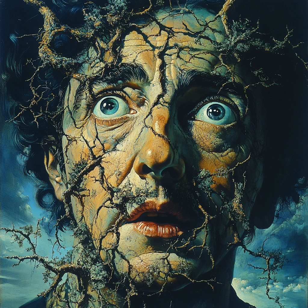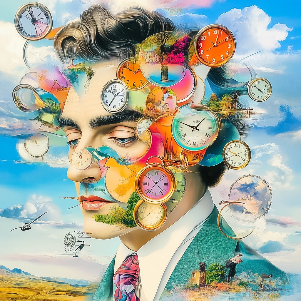 살바도르 달리는 그의 초현실주의 스타일을 담아 녹아내리는 시계와 기괴한 풍경이 얼굴과 뒤섞여 환상적인 이미지를 만들어냈습니다.