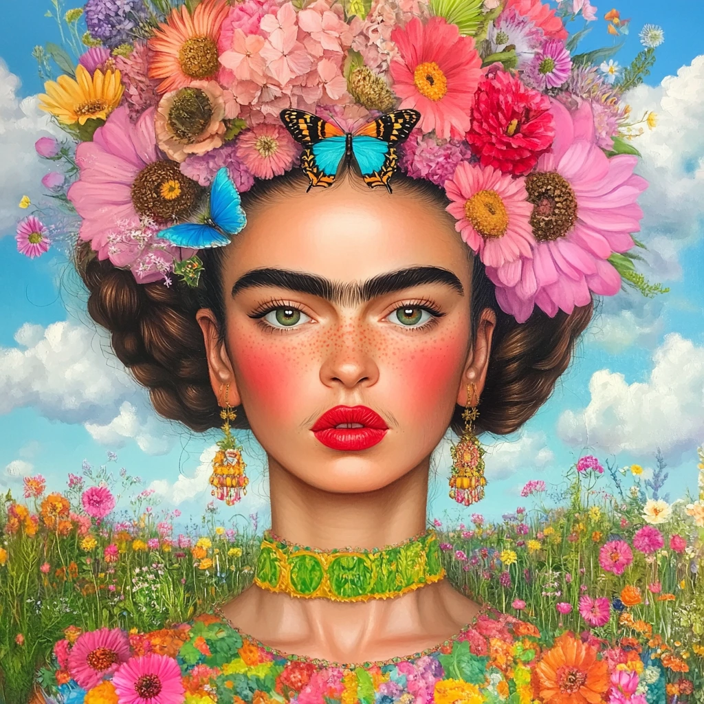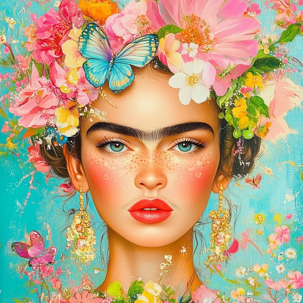 프리다 칼로의 얼굴을 그리며, 그녀의 자화상에 자주 등장하던 심리적 상징과 열정적인 붉은색을 주요 요소로 삼았습니다.