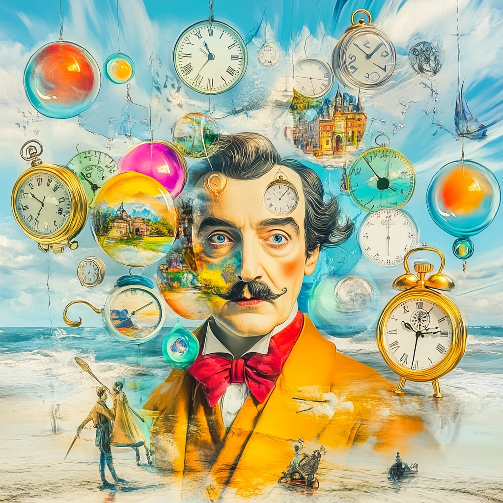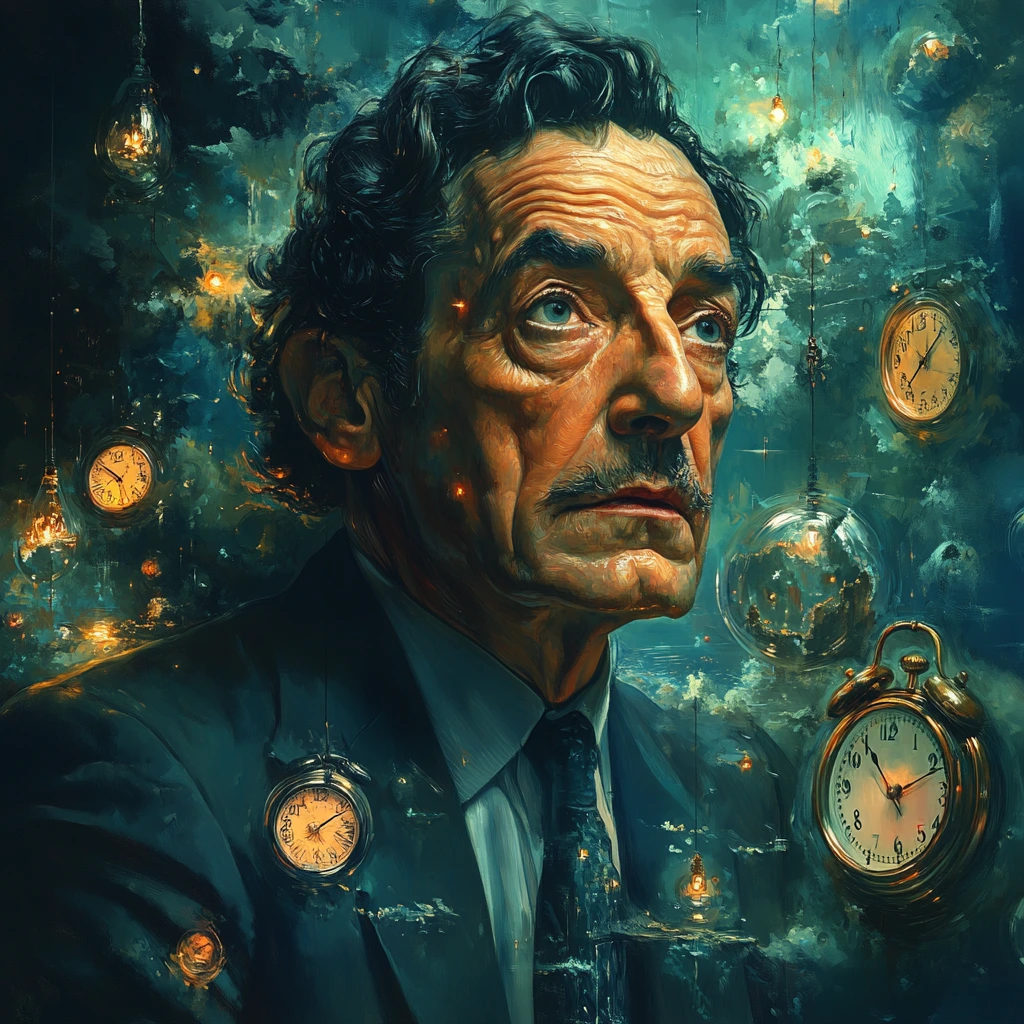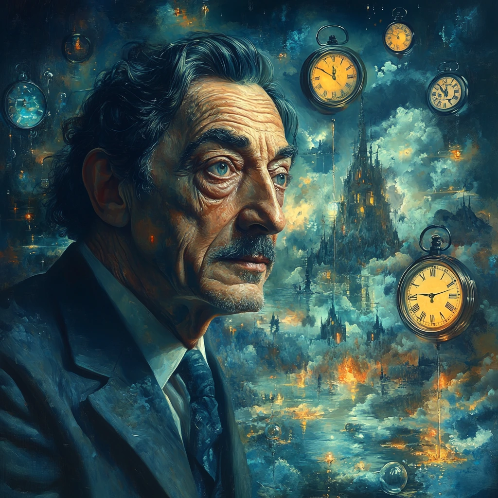 "초현실주의 스타일로 표현된 살바도르 달리의 디지털 초상화. 그의 얼굴과 녹아내리는 시계, 왜곡된 풍경이 뒤섞인 환상적인 이미지."