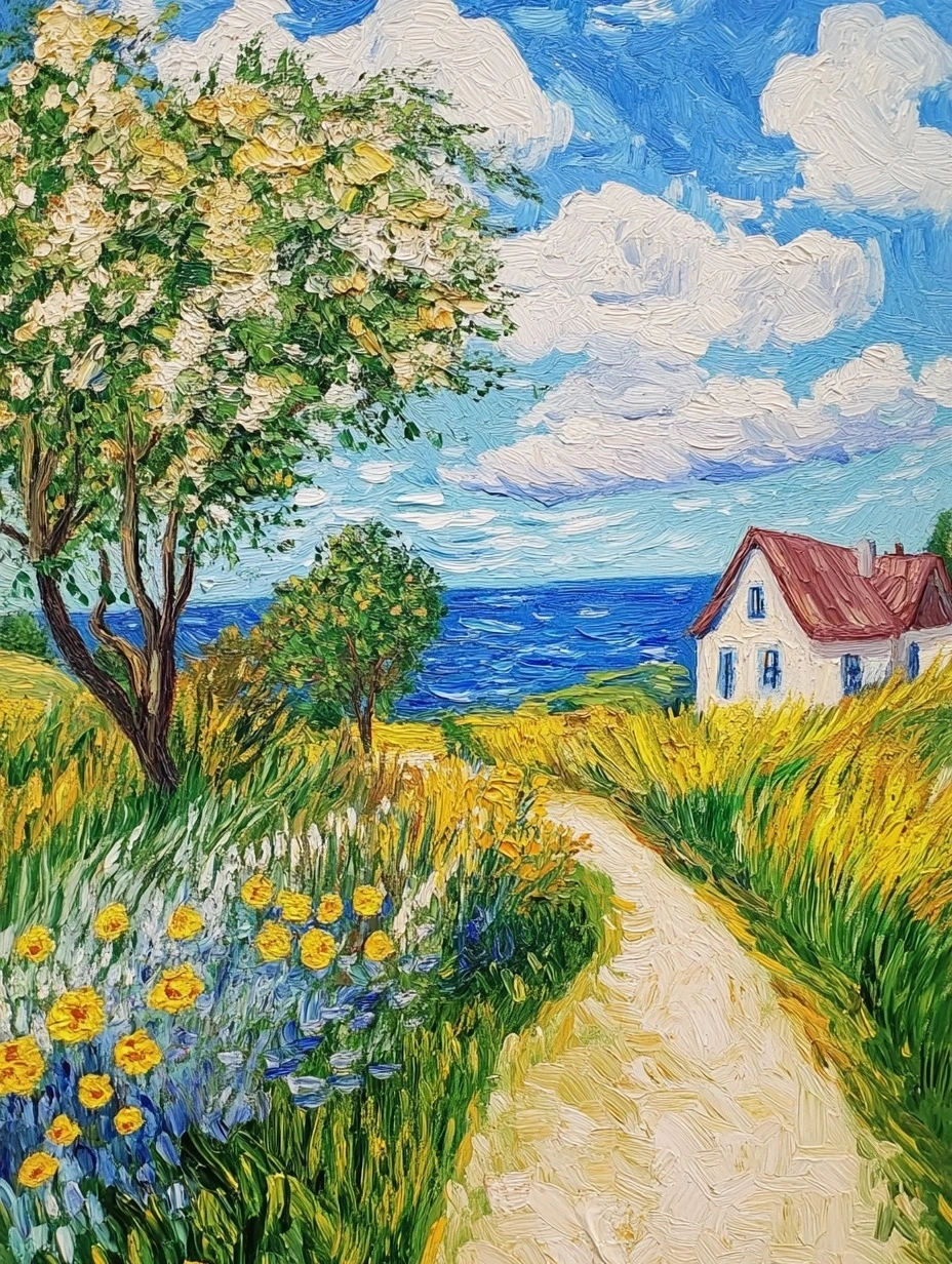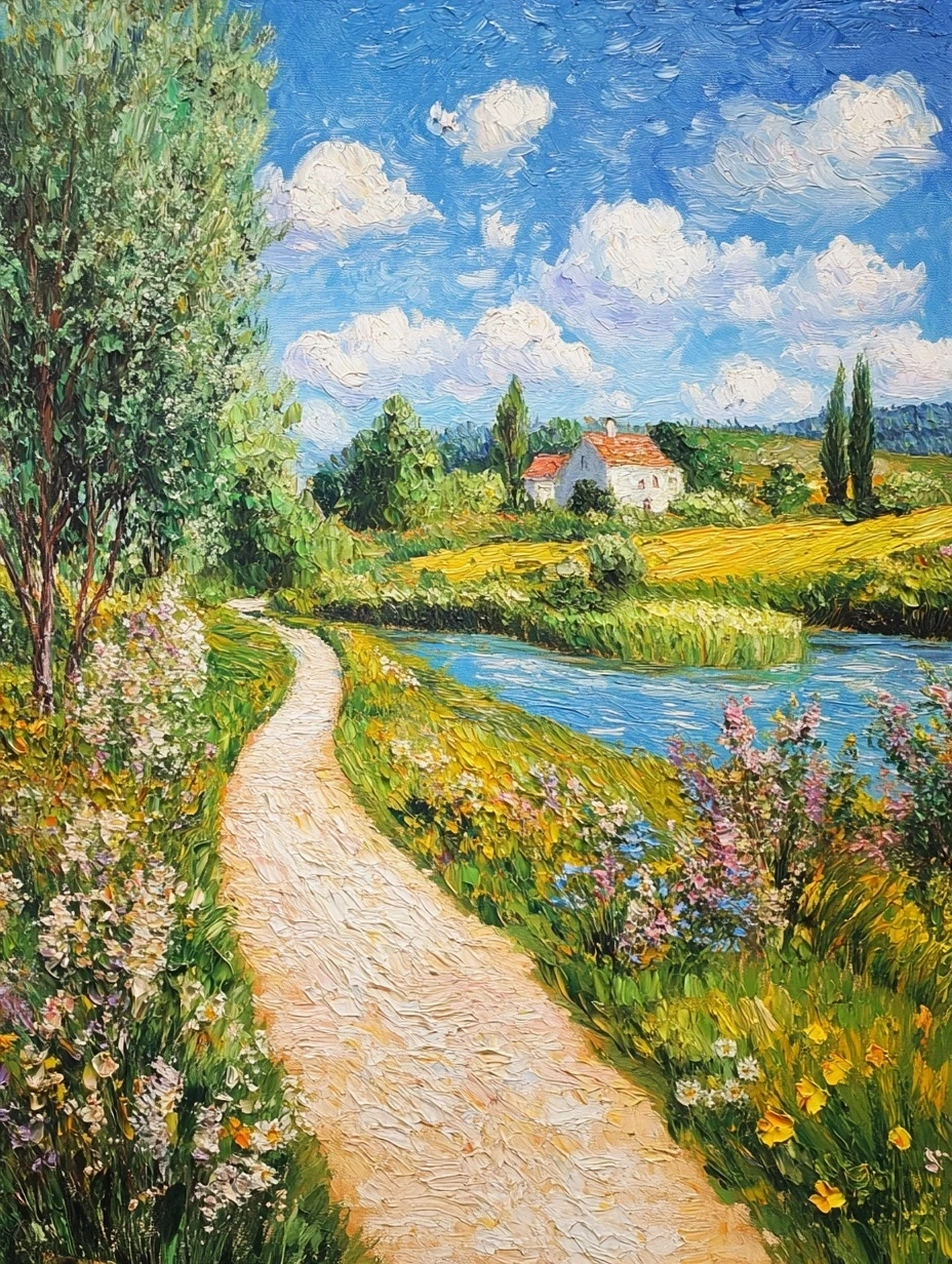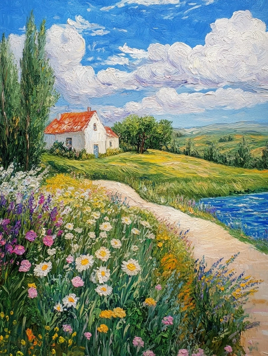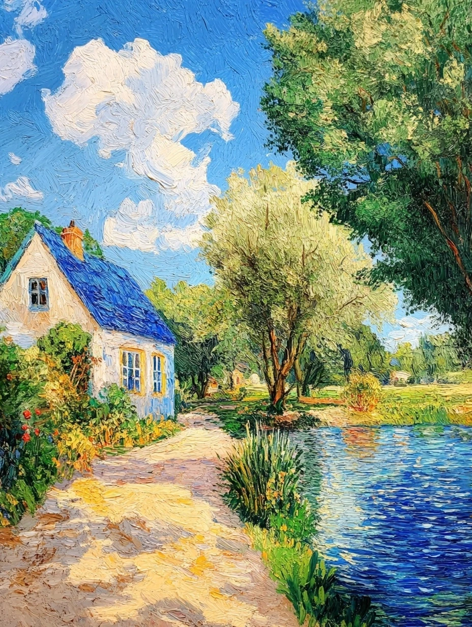 A peaceful countryside, Van Gogh Style, oil painting texture --ar 16:9