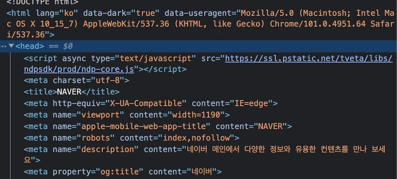 HTML은 작성된 문서를 운영체제와 상관없이 브라우저만 있다면 다른 OS, 기기에서도 동일한 화면을 보기 위해 만들어졌습니다. HTML은 프로그램 언어라기보다 단순히 문서를 적은 언어에 가까운데요, 각 문서에 링크를 걸어 이곳저곳을 이동하며 정보를 얻기 위해(하이퍼링크의 개념) 개발되었습니다. HTML은 보고 계신 모든 웹사이트에서 바로 확인할 수 있어요. 지금 보고 계신 화면의 마우스 우클릭 후 [검사]를 선택하시면 아래와 같은 HTML 문서를 볼 수 있습니다.