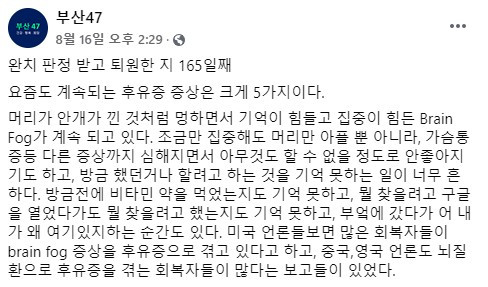 그는 "이미 체계적인 후유증 관리를 위한 재활시스템을 국가가 나서서 진행하고 있는 국가도 있는 상황에서 우리나라도 이제라도 제대로 된 정보 축적과 공유 및 체계적인 제도 보완에 완치판정 후 5개월 반이나 지난 후에도 각종 후유증을 겪고 있는 저의 경험이 도움이 되었으면 좋겠다고 생각한다"고 말했다. (부산 47번 환자 부산대 박현 교수)
