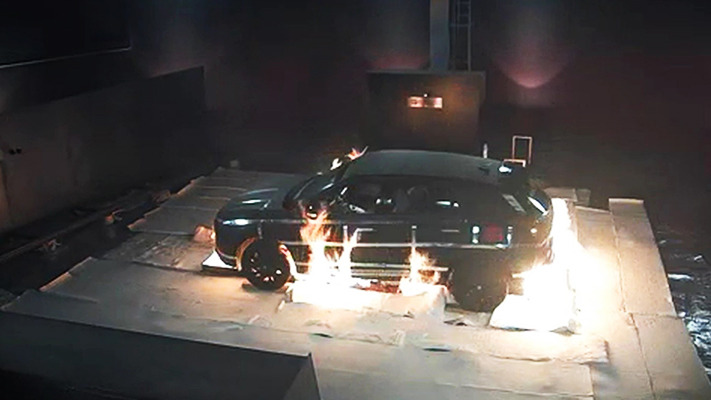 현대자동차의 수소전기자동차인 '넥쏘'의 화재 안전성 시험 사진, 의도적으로 차에 불을 붙인 모습이다.
